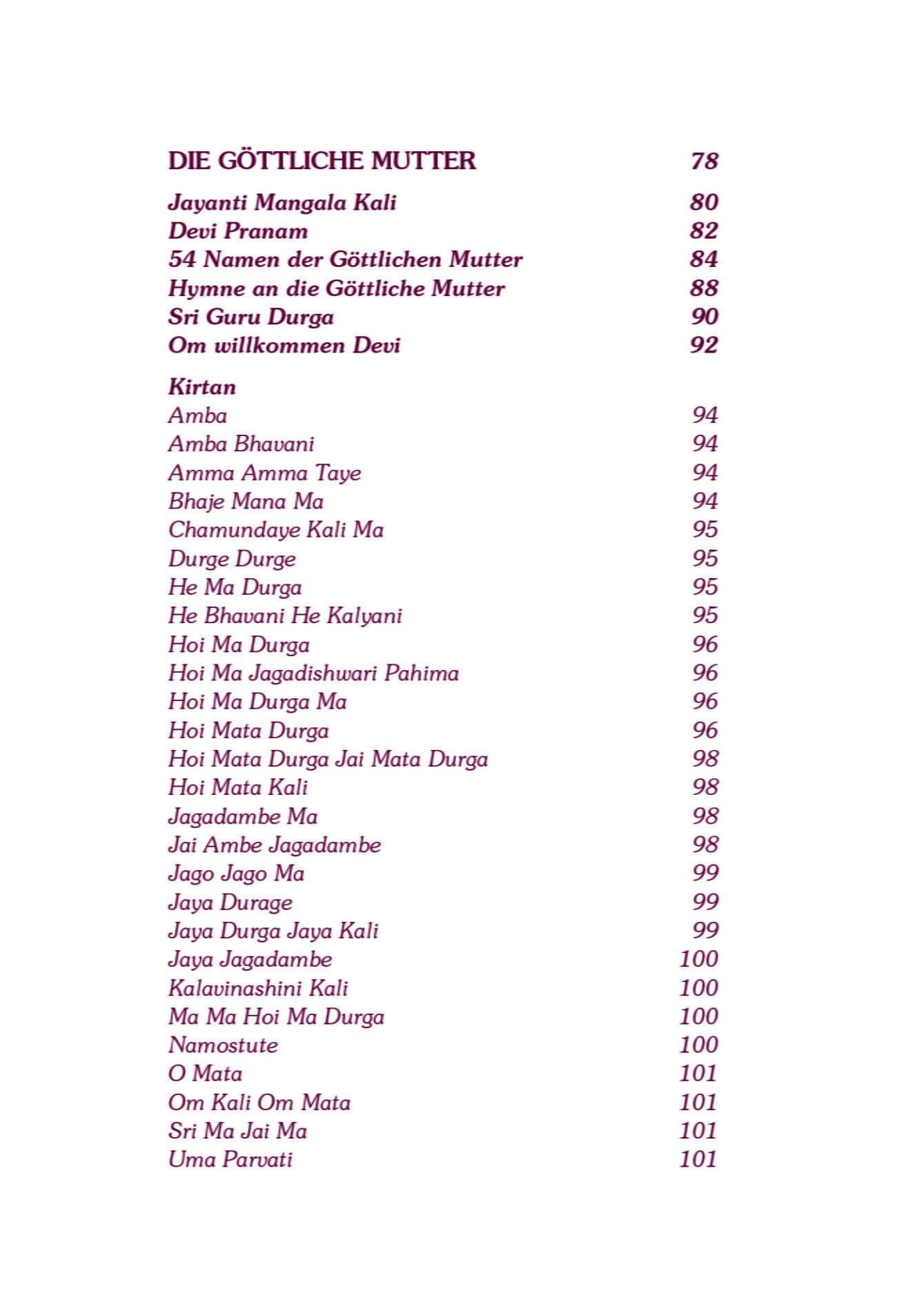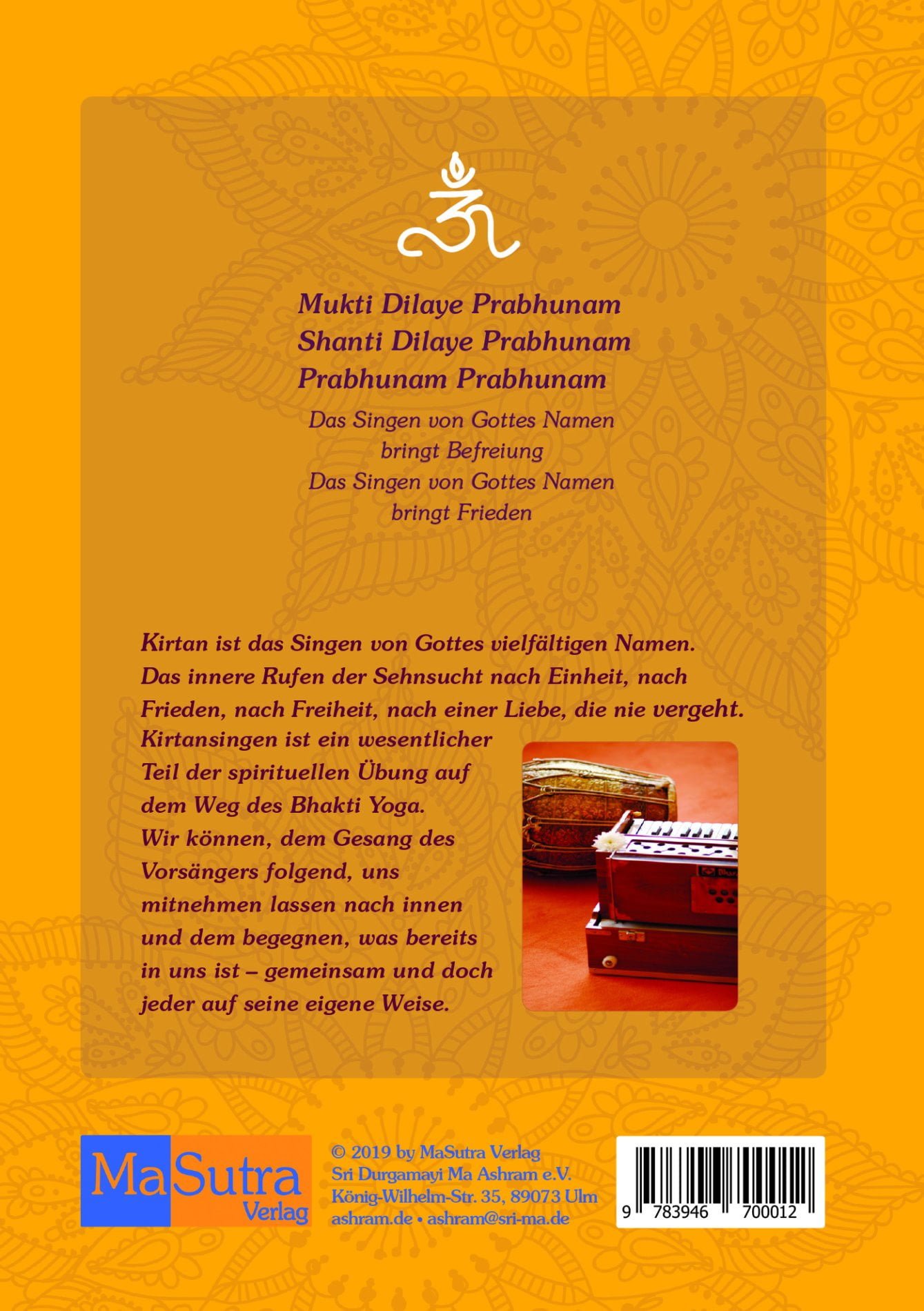 Dieses wunderschöne Kirtanbuch enthält über 100 Kirtan, Bhajan, Aarti und Mantra, die im Durgamayi Ma Ashram gesungen werden. Bordun-Töne zur Begleitung mit dem Harmonium sind enthalten.
