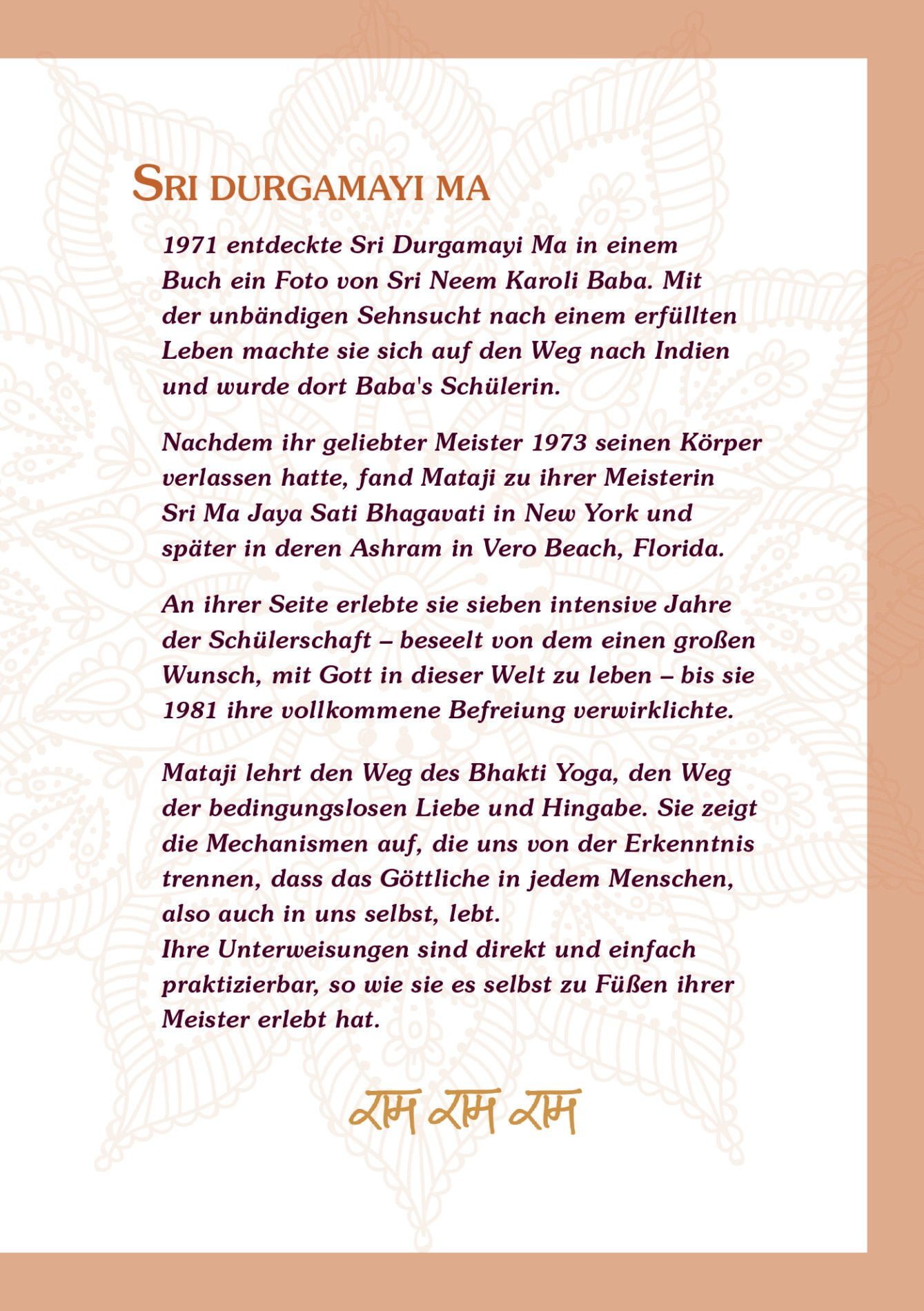 Die handschriftlichen Texte wurden von Ma und ihrem spirituellen Weggefährten Vishnu Digambar aufgeschrieben und stammen teilweise noch aus der Zeit, in der Ma selbst als Schülerin in den Ashram ihrer Meister Sri Neem Karoli Baba und Ma Jaya Sati Bhagavati gelebt hat.