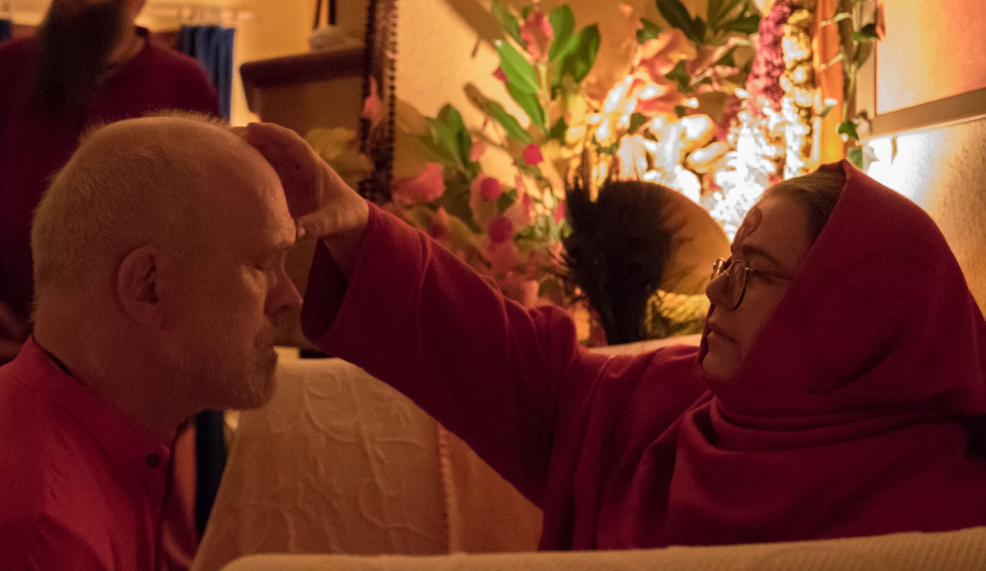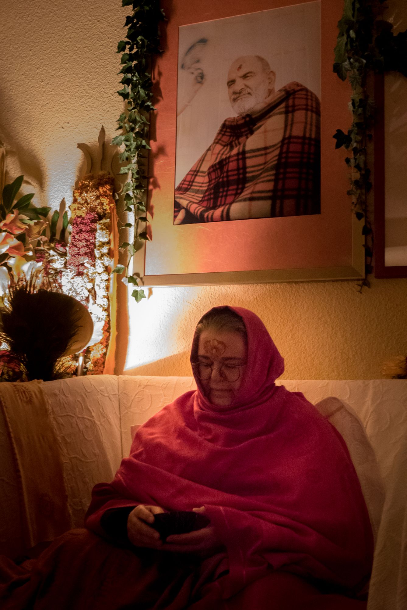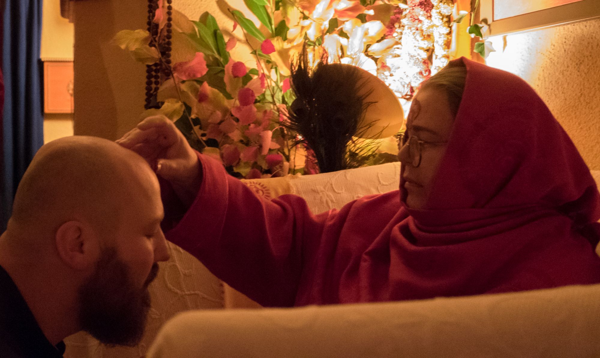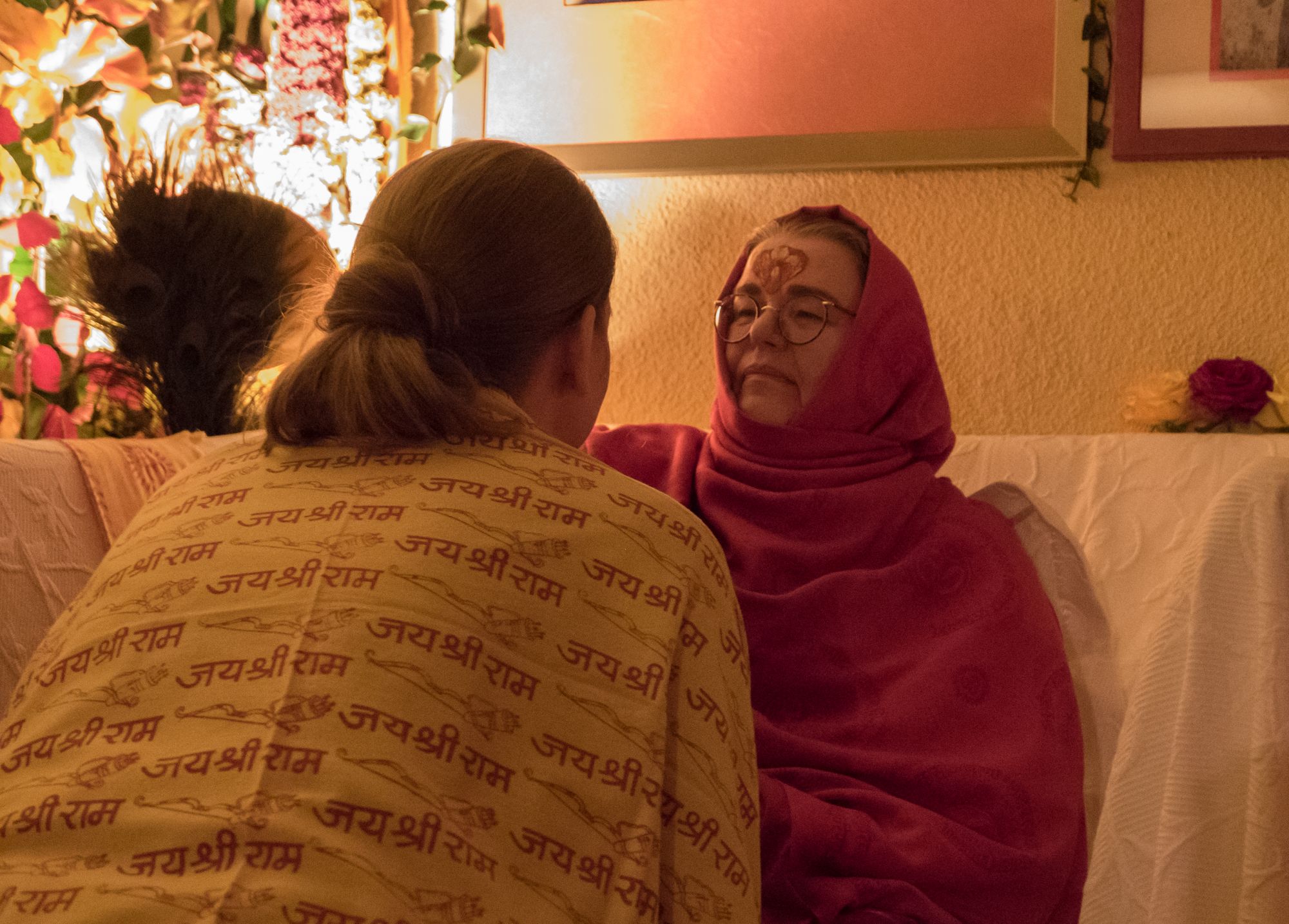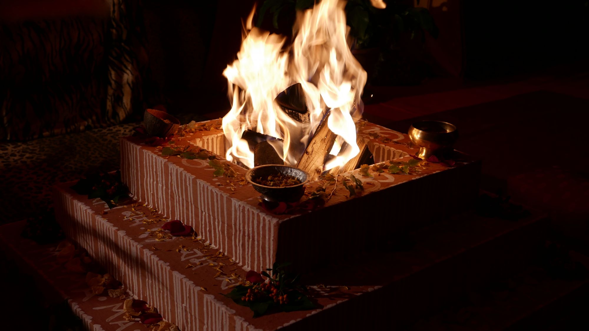 Am Abend schmückte Ma jeden von uns mit einem Tilak und ehrte mit ihren Schülern die göttliche Mutter in einer Feuerzeremonie am Dhuni. Einzeln hatte ein jeder die Möglichkeit, Ma eine Sache zu übergeben, die uns auf unserem spirituellen Weg hindert und die wir überkommen wollen, indem wir es vor Ma laut vorlasen und Ma unsere Worte dem heiligen Feuer übergab.