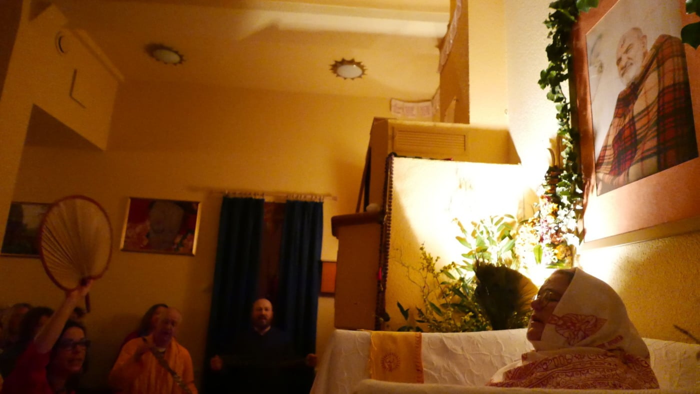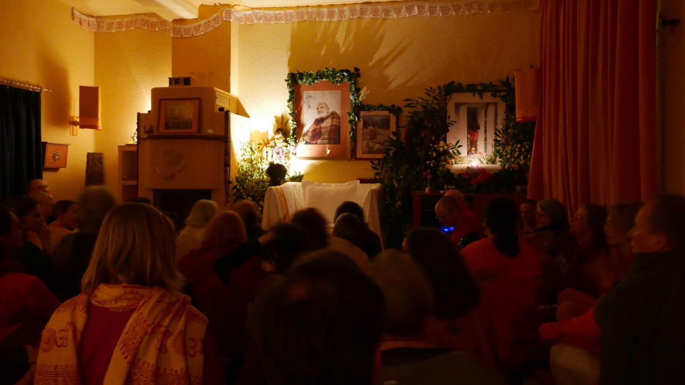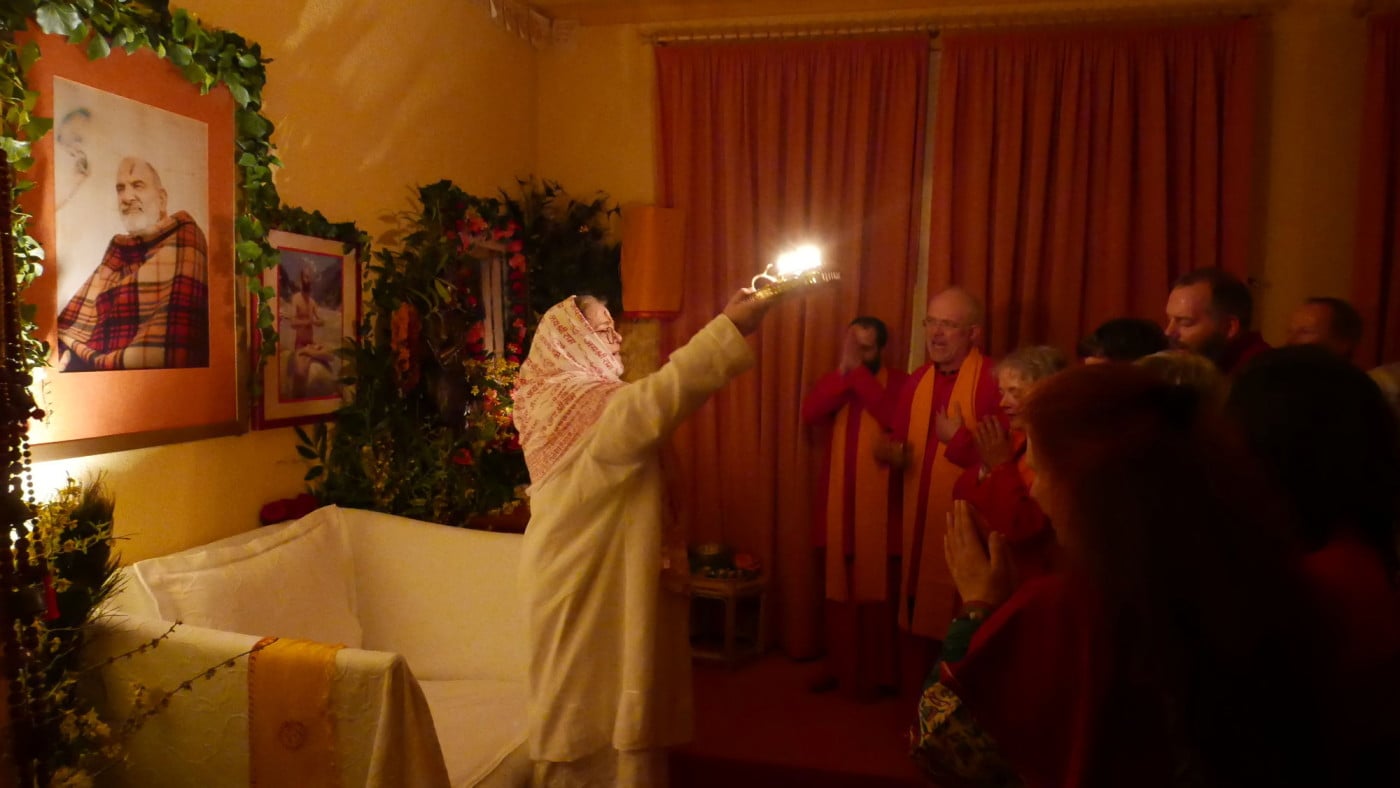 Ma’s Segen und Präsenz trugen uns von einer Chalisa zur nächsten, bis wir nach neuneinhalb Stunden, vom Singen durchdrungen bis in die Haarspitzen, Hanuman Ji zum Abschluss des Festes mit einer großen Aarti ehrten. Und anlässlich Samadhi’s erstem Todestag ließ Ma ein Bild von Samadhi zu Füßen Hanumans aufstellen, sodass wir mit diesem schönen Fest auch ihrer gedenken konnten. Am Ende der Aarti nahm Ma das Licht und schwenkte es zu allen Anwesenden mit den Worten: „Was für ein Wunder!“