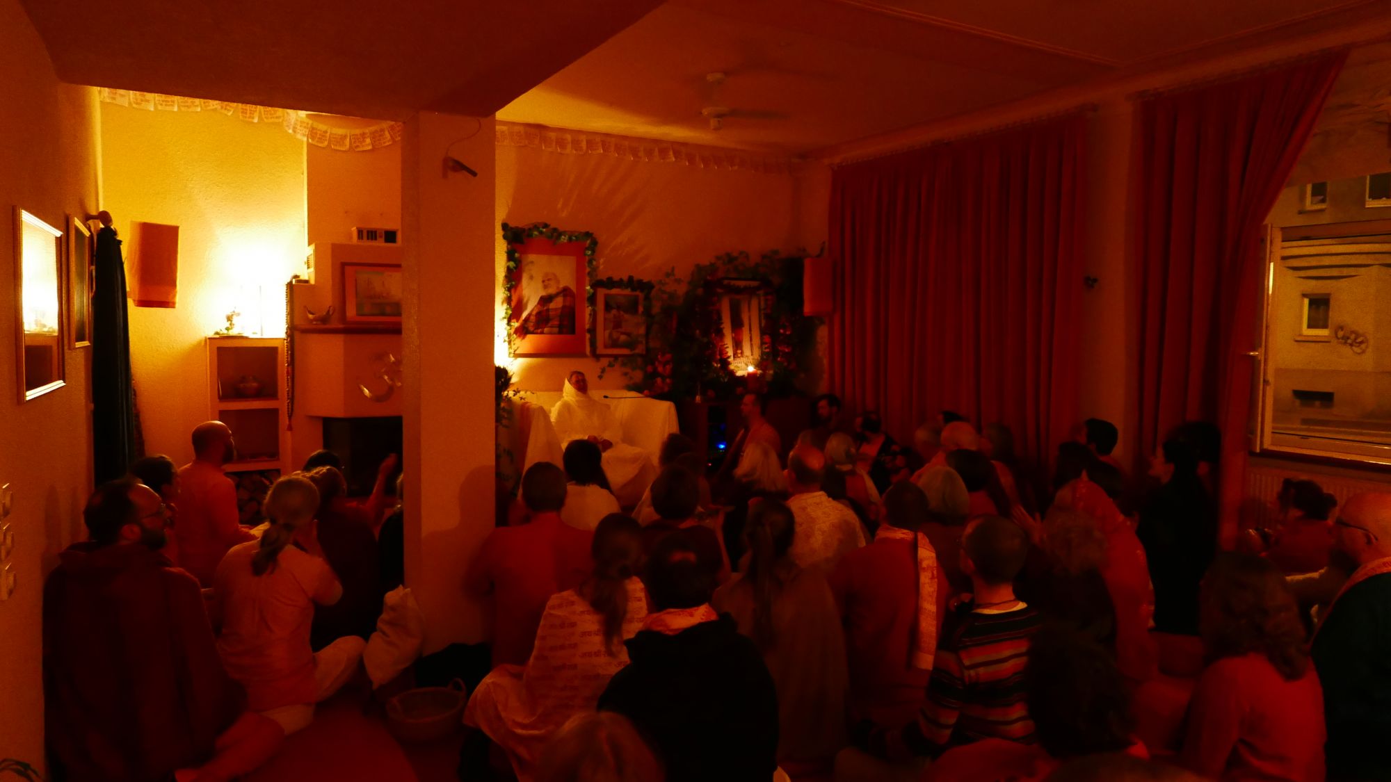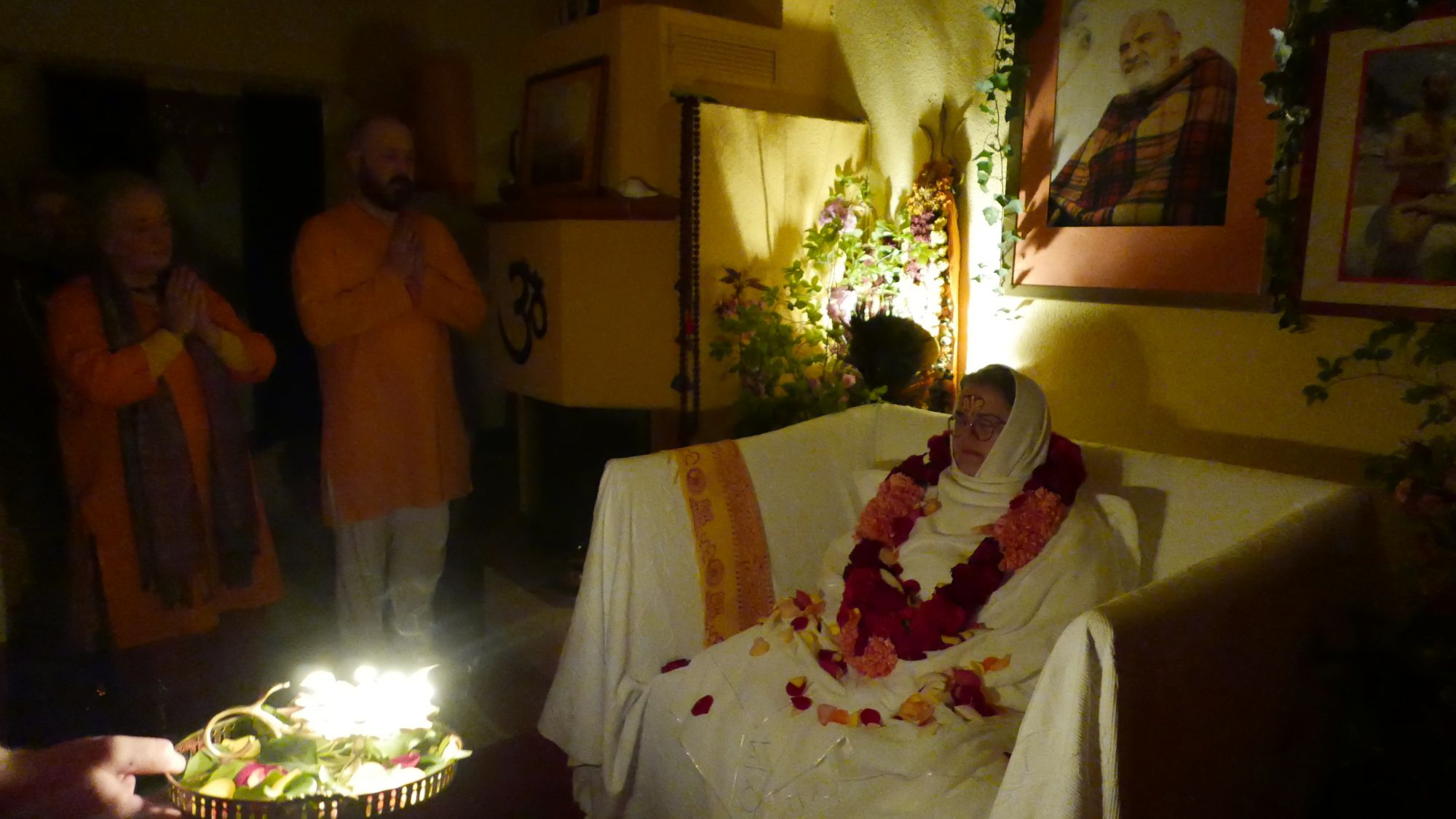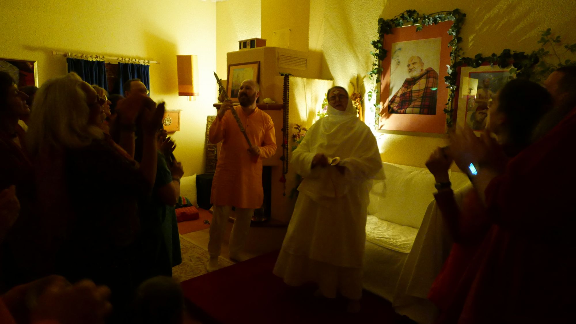 Unsere Meisterin Durgamayi Ma sang mit uns Schülern 108 Hanuman Chalisa durch eine ganze unbeschreibliche Nacht. Wir sangen uns durch alle inneren Schwierigkeiten, getragen, geführt und beflügelt durch unsere Meisterin, die uns mit größter Freude und Liebe geleitete.