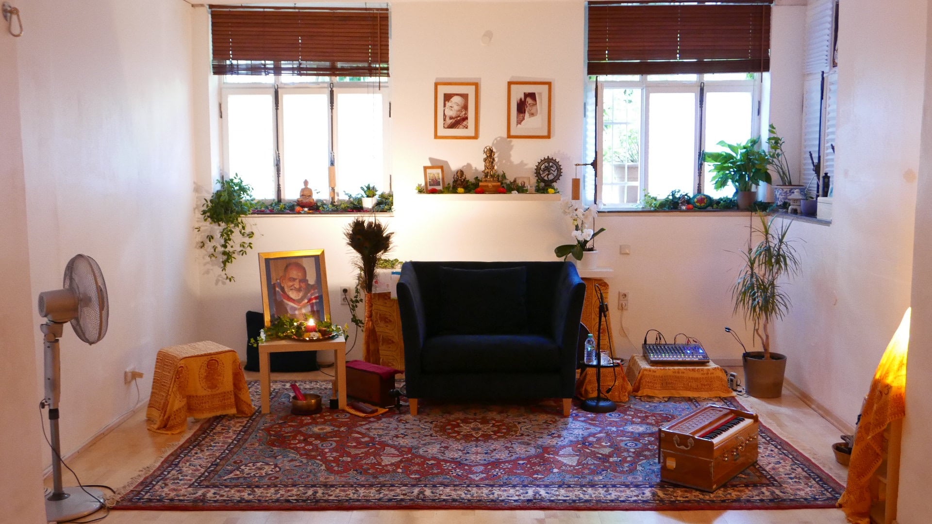 Die Yogaschule war von Kölner Schülern und Schülerinnen und den Ashram-Schülern, die Ma aus Ulm begleitet haben, liebevoll vorbereitet und Ma wurde Freitagabend voller Freude von allen Anwesenden empfangen.