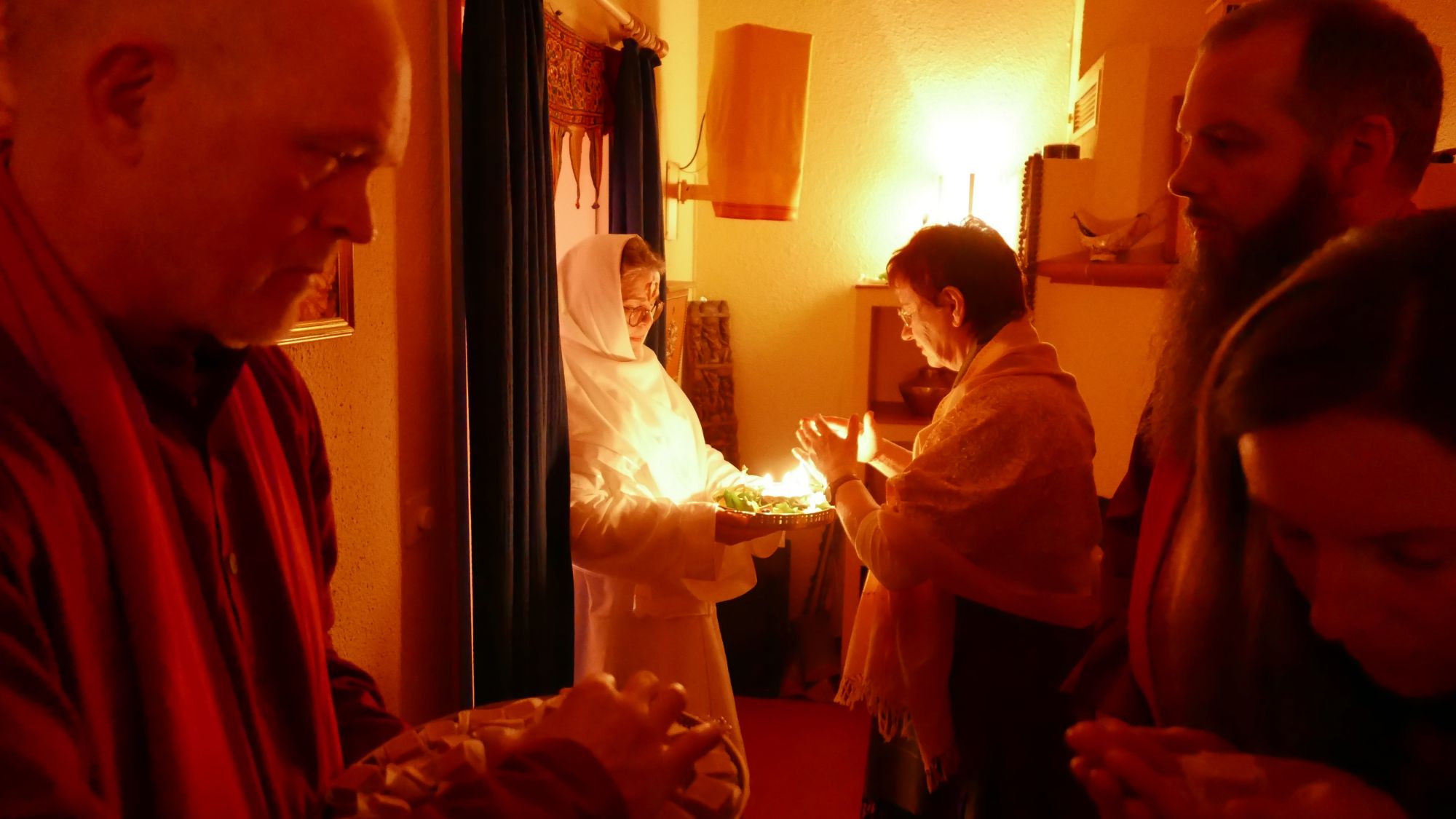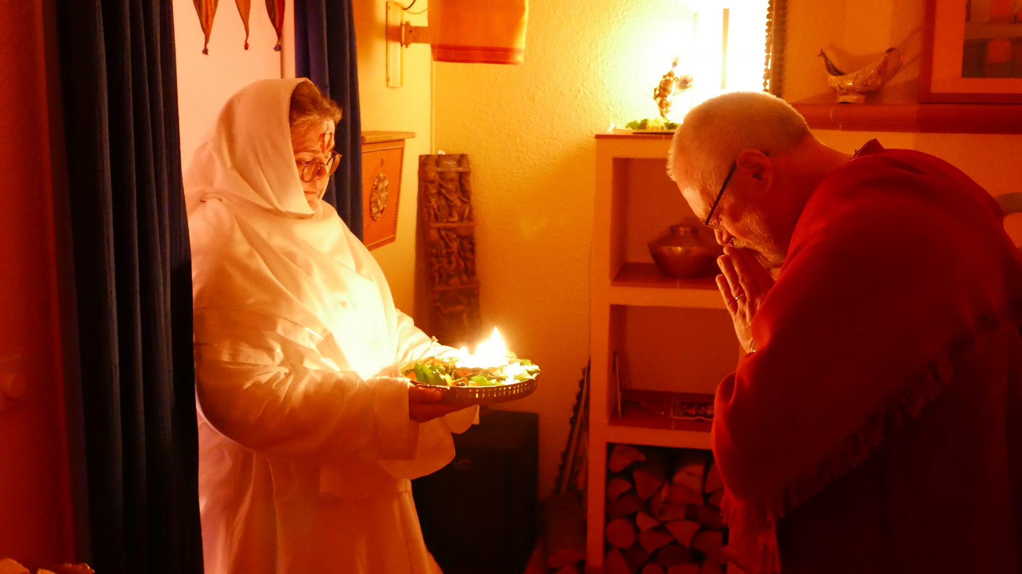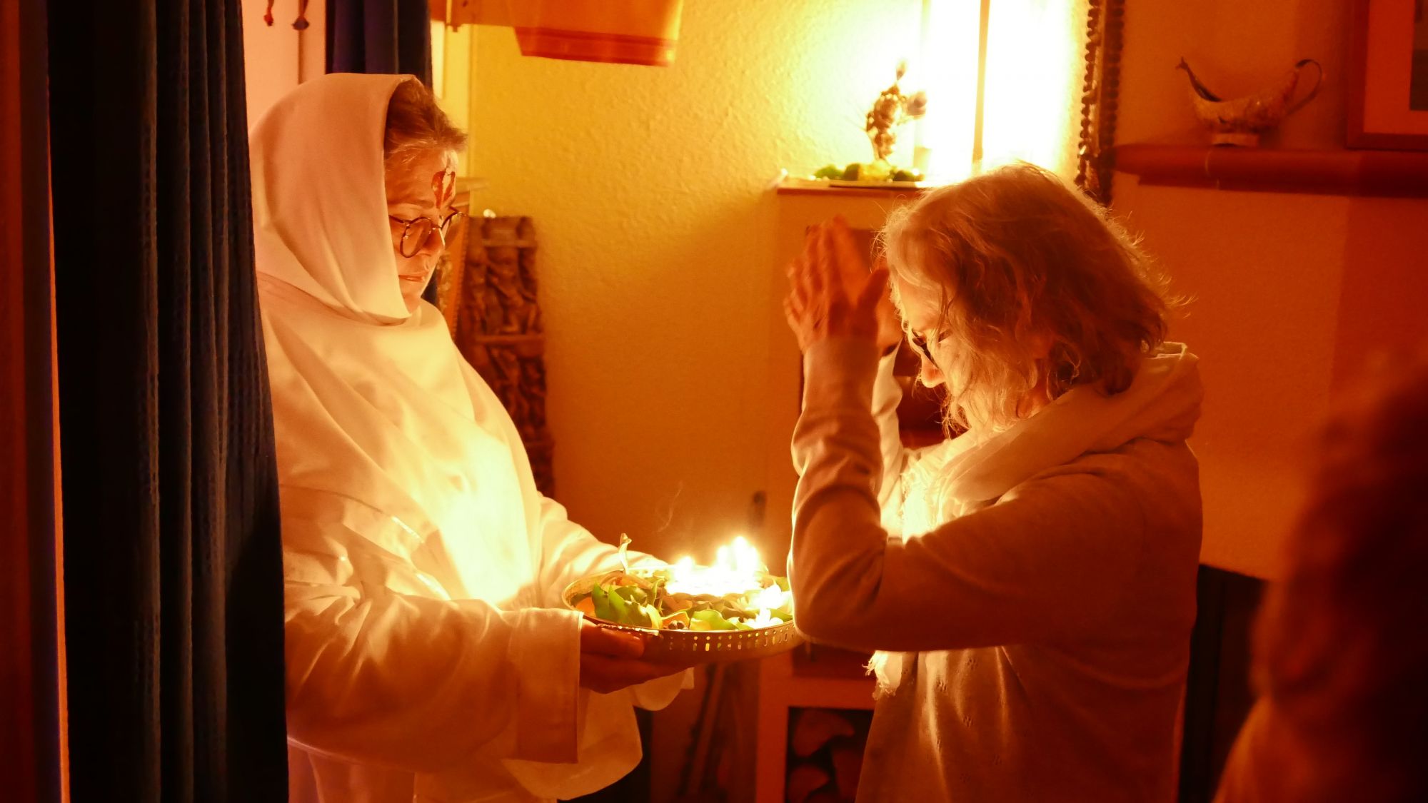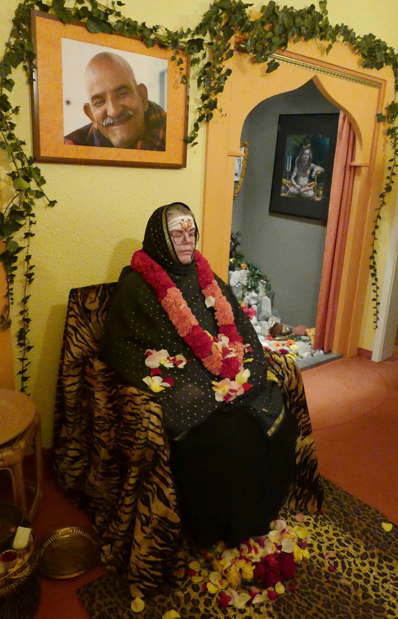 Wir hörten die Entstehungsgeschichte von Shivaratri und Ma sprach zu uns über ihr eigenes Erleben – vor vielen Jahren, als spirituelle Schülerin – wie sie sich damals vorgestellt hatte auf dem Wege zu Shiva, zu diesem höchsten Bewusstsein in uns selbst, sich als inneres Bild nach und nach aller Kleidungsstücke zu entledigen, um nackt das strahlende Licht Shiva’s empfangen zu können. Zum Abschluss des Festes feierten wir eine Aarti zu unserer Meisterin als Shiva und anschließend schmückte Ma – wie jedes Jahr – voller Liebe und voller Hingabe jeden einzelnen von uns mit Shiva-Tilak.