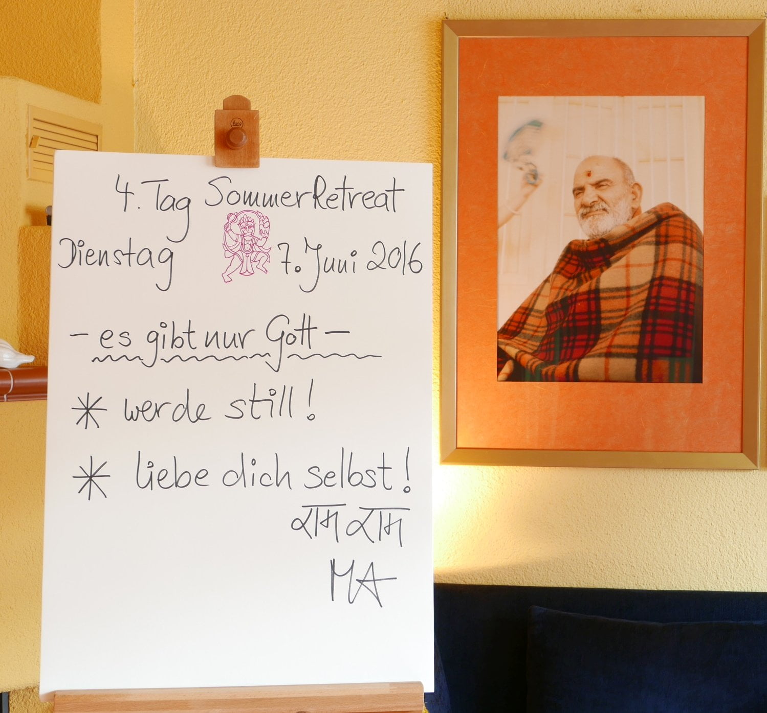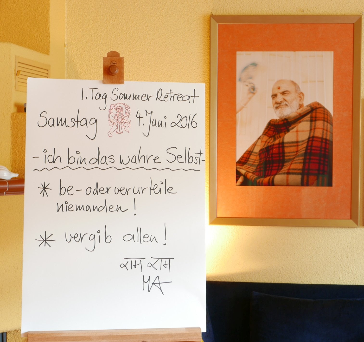 An jedem Tag des Retreats schrieb Ma uns eine spirituelle Wahrheit auf ein großes Flipchart – und, um uns dieser innerlich öffnen zu können, zwei konkrete Übungen dazu für den jeweiligen Tag. Am fünften und letzten Tag fasste Ma die vier Wahrheiten und acht Übungen in diesem schönen Mandala zusammen und sagte folgende Worte dazu: