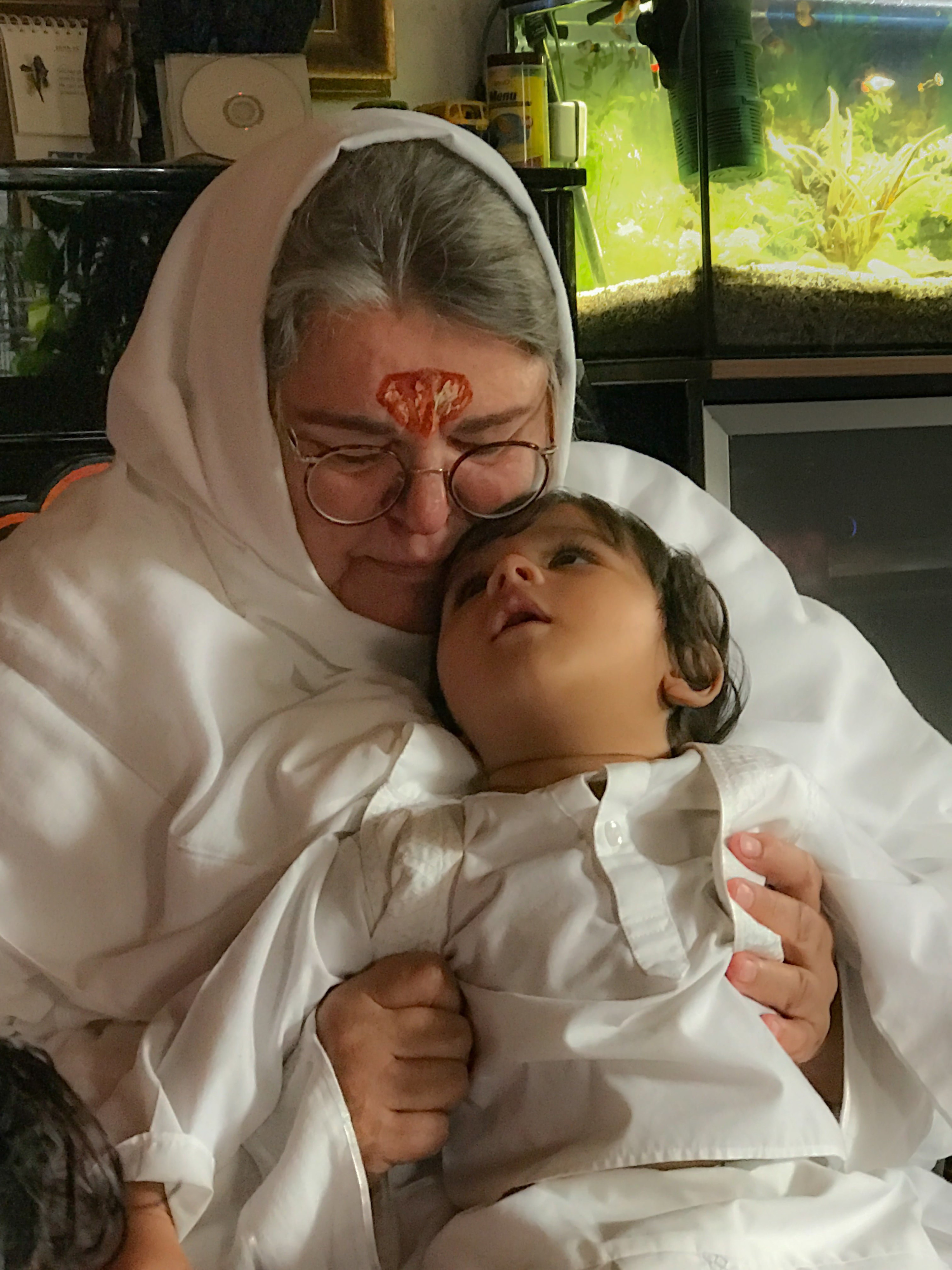 Als Ma Ayushmaan im Arm hielt, Anushree’s und Rahul’s Sohn, war da ein Moment, als er vollkommen still wurde, als folgte er Ma’s Rufen in die göttliche Welt, die Ma’s Zuhause ist – und er nahm uns alle mit. Der Raum fühlte sich auf einmal an, als wären wir alle im Nirvana.