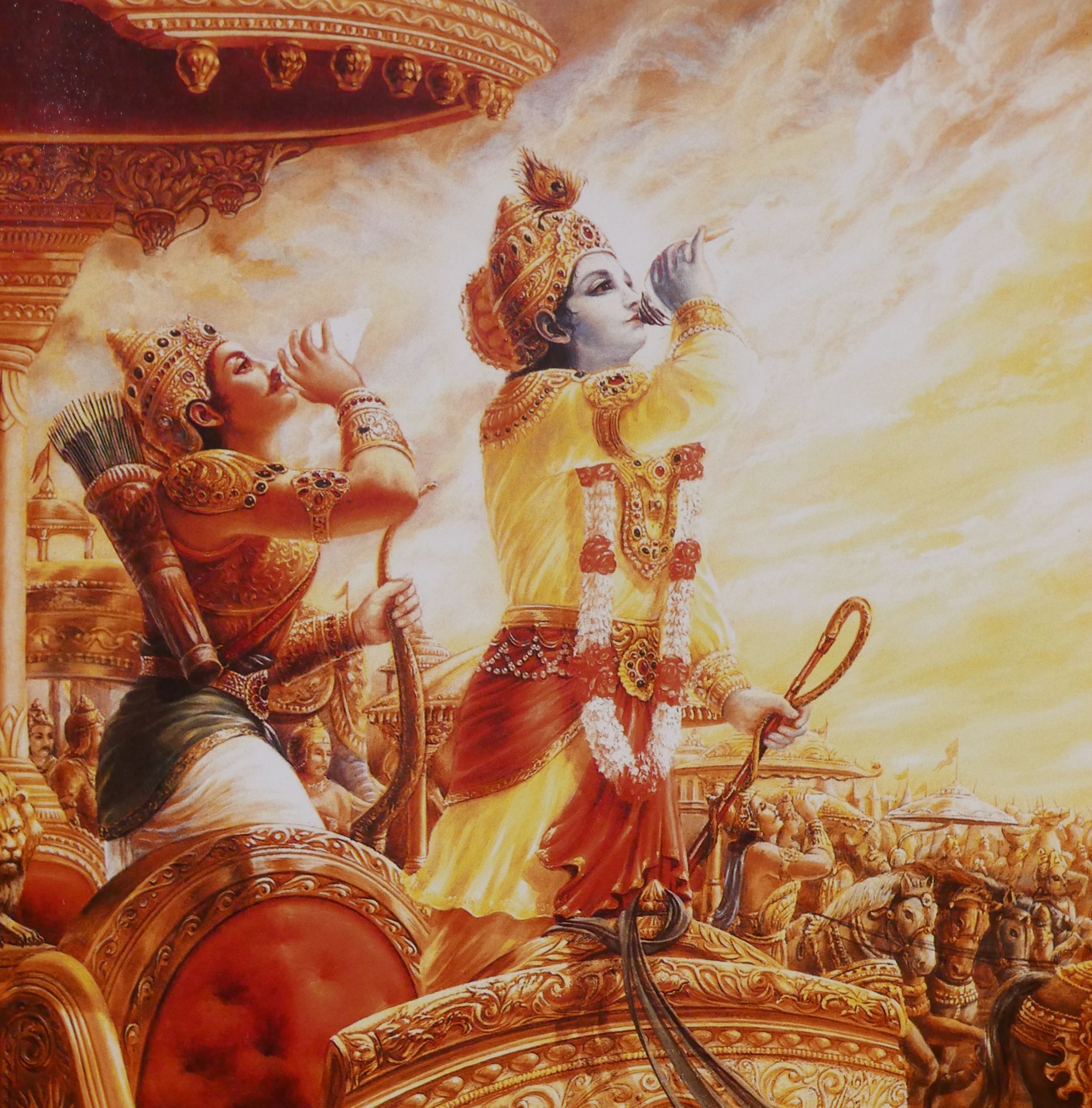 Als Arjuna’s Sohn Abhimanyu in dieser kriegerischen Auseinandersetzung getötet wird und sich Arjuna’s Herz, von Trauer überwältig, droht zu verschließen, spricht der göttliche Krishna folgende Worte zu ihm: