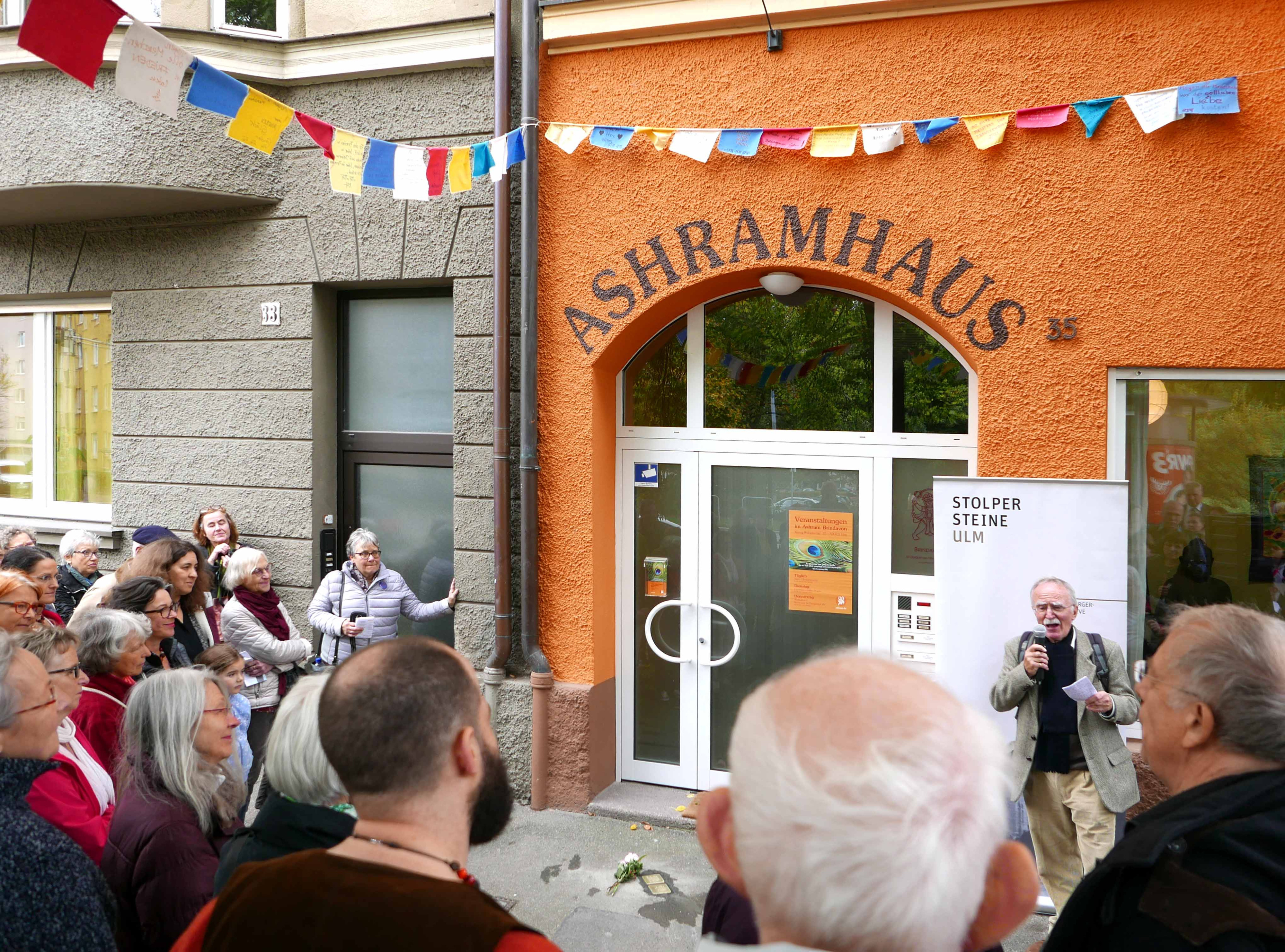 Dr. Silvester Lechner vom Dokumentationszentrum Oberer Kuhberg erwähnte in seiner lebendigen Rede zum Leben der Eheleute Barth das geistige Band, das zwischen dem Ashram und der Initiative Stolpersteine besteht – 2001 hatte der Ashram den gesamten Erlös des Tages der offenen Tür der Ulmer KZ-Gedenkstätte als Spende übergeben.