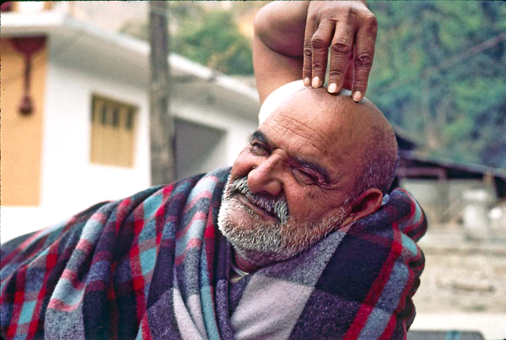 Siddhi Ma hielt ein Bild von Maharaji in den Händen, das ihn auf der Seite liegend zeigte, eine klassische Brezel, mit einer Hand auf seinem Kopf. Sie sagte, dass diese Mudra mit der Hand auf dem Scheitel des Kopfes bedeutet: „Sorge dich um nichts. Ich habe alles unter Kontrolle."