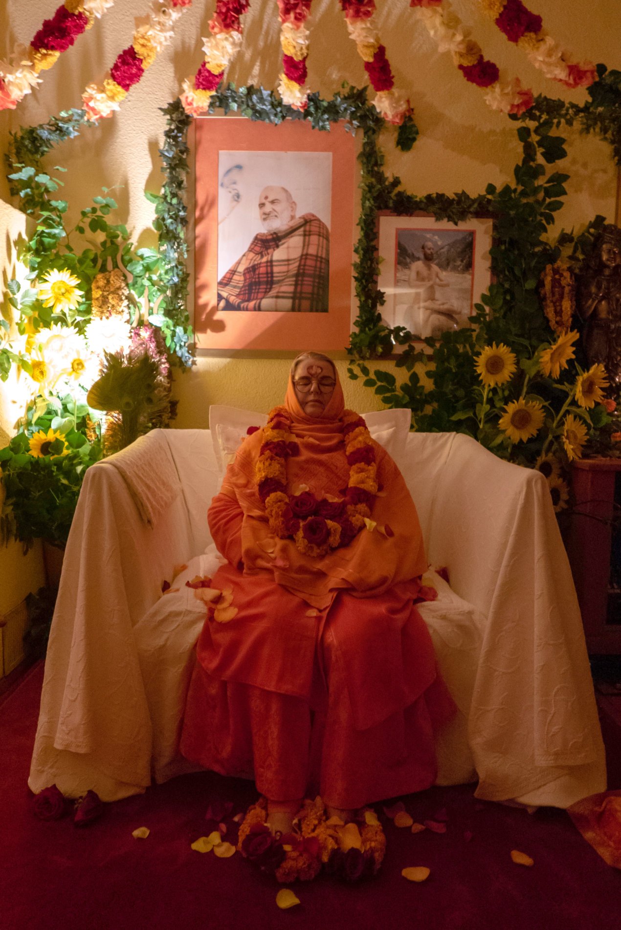 Der festlich geschmückte Tempel im Ashram zu Gurupurnima