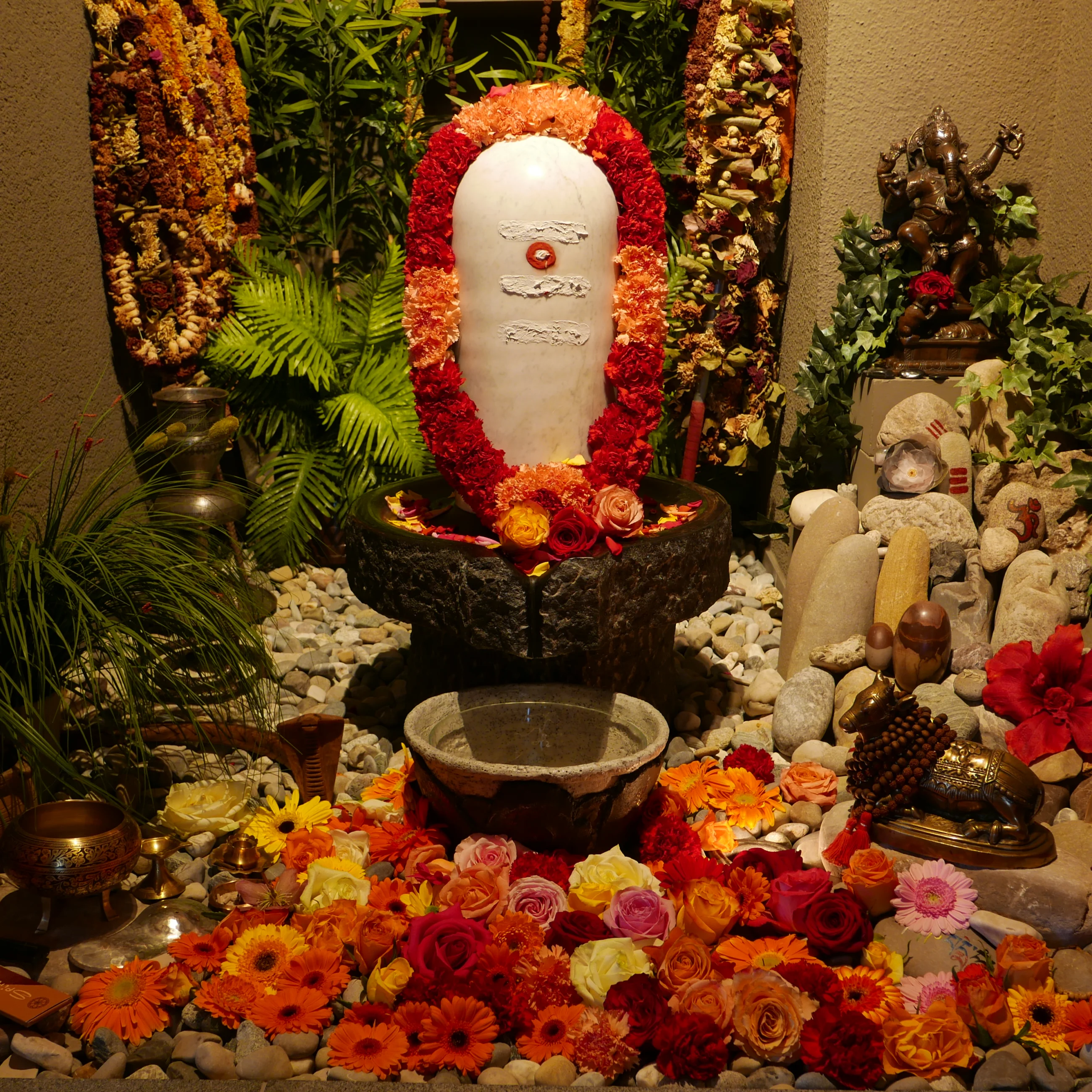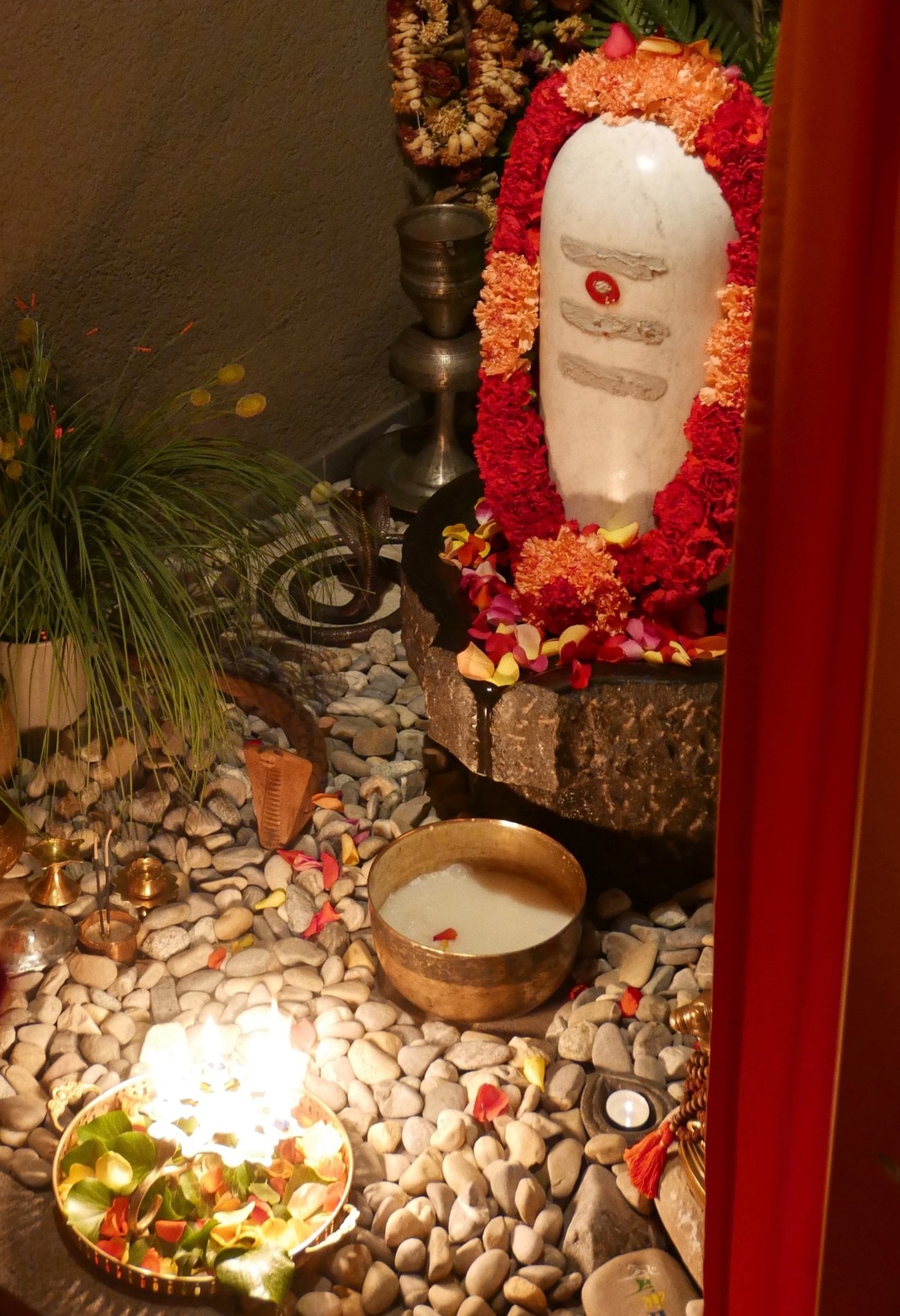 Linga Puja: Wir ehren das Höchste Bewusstsein in der Form des Shiva Lingam. Der Pujari übergießt den Lingam mit Panchamrit, einer symbolischen Mischung aus Milch, Joghurt, Honig, Zucker und Ghee, und schmückt ihn mit Tilak, Blüten und einer Blumenmala. Dann schwenkt er das Licht und alle singen gemeinsam die Aarti zu Shiva. Nach der Puja verteilt der Pujari das Panchamrit als Prasad.