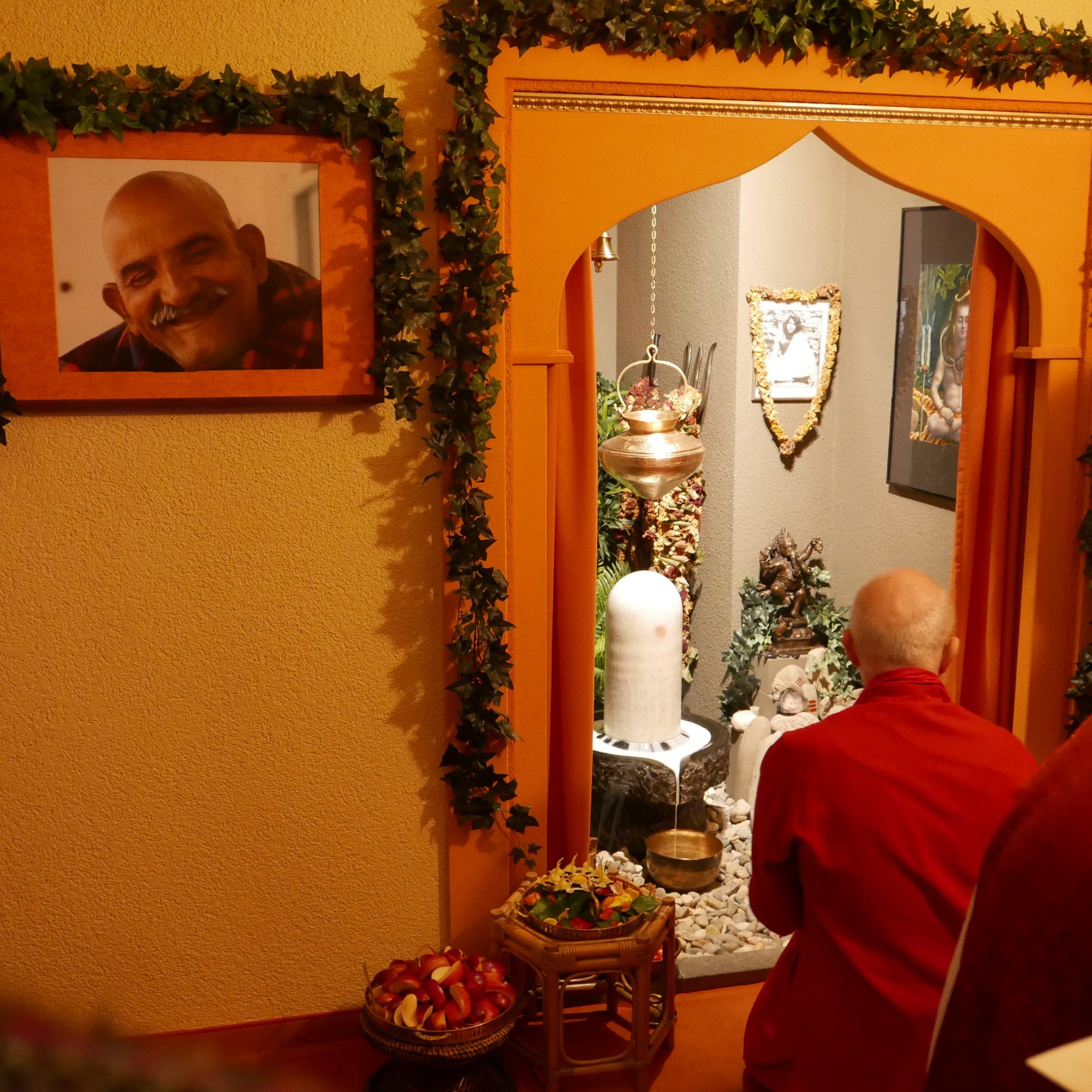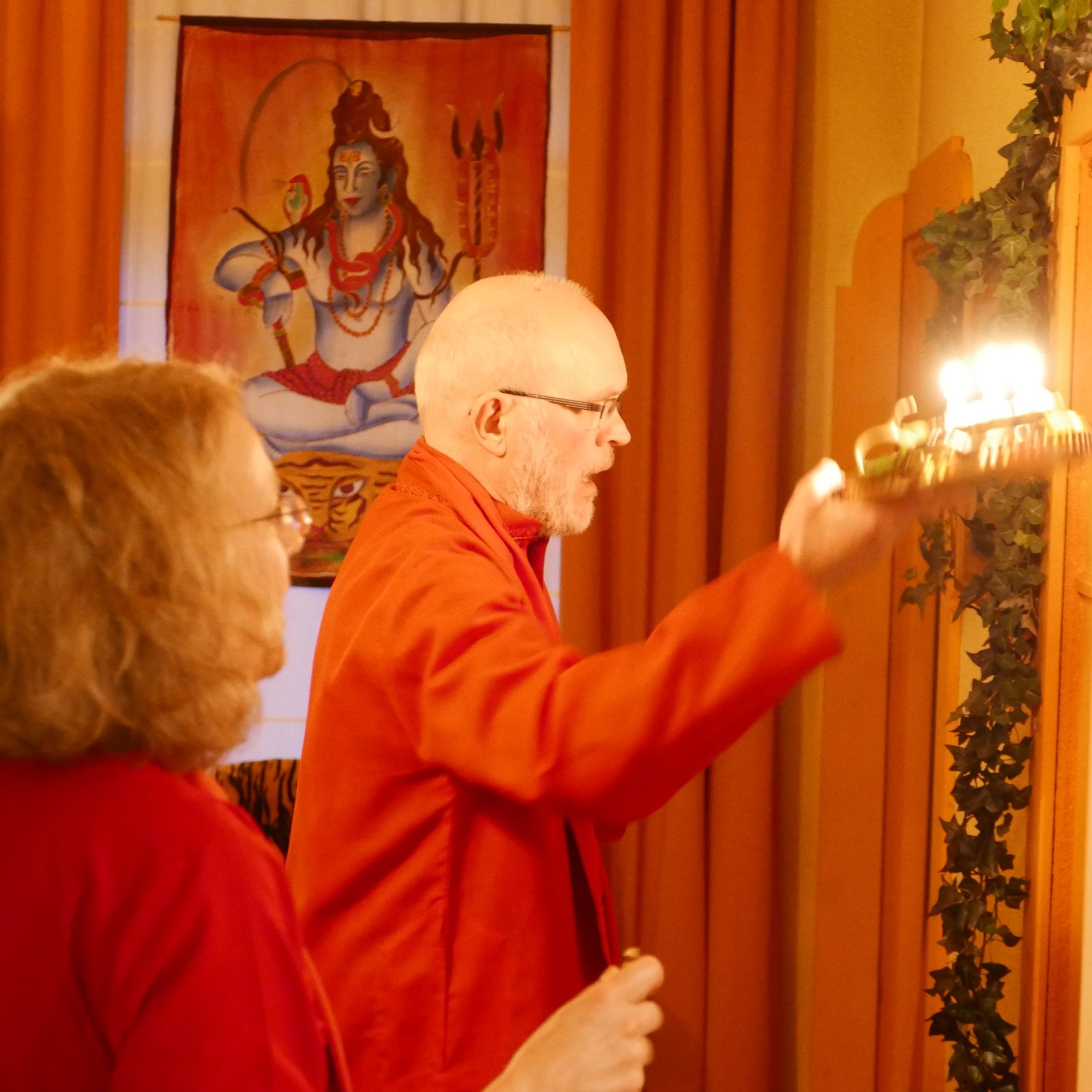 Wir ehren Ma mit einer Mala als einen Menschen, der das Shiva-Bewusstsein verwirklicht hat und singen die Shiva Aarti. Nach kurzer Zeit steht Ma auf und geht ins Tempelzimmer.