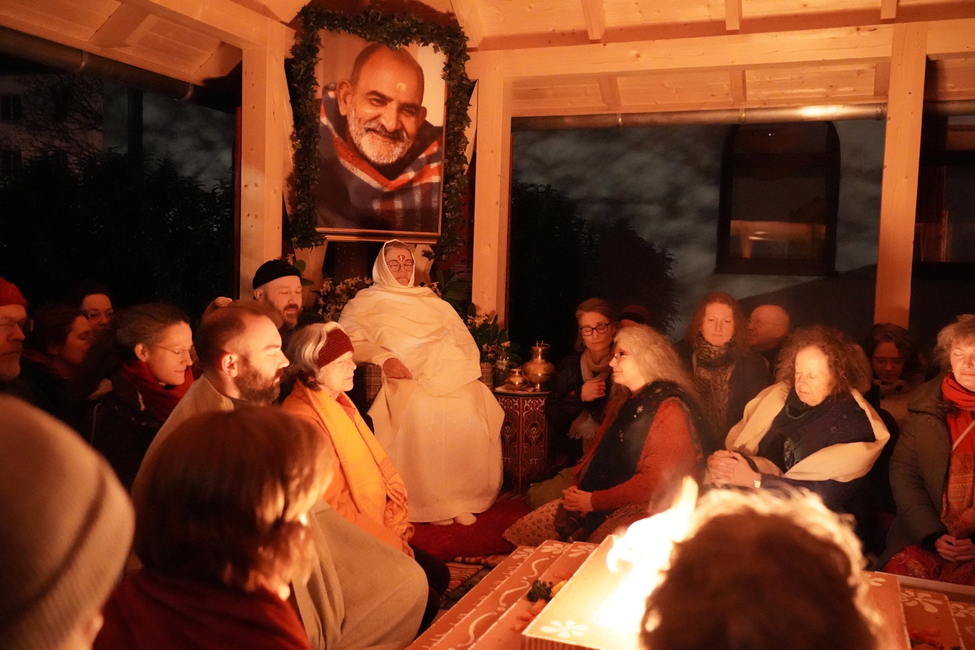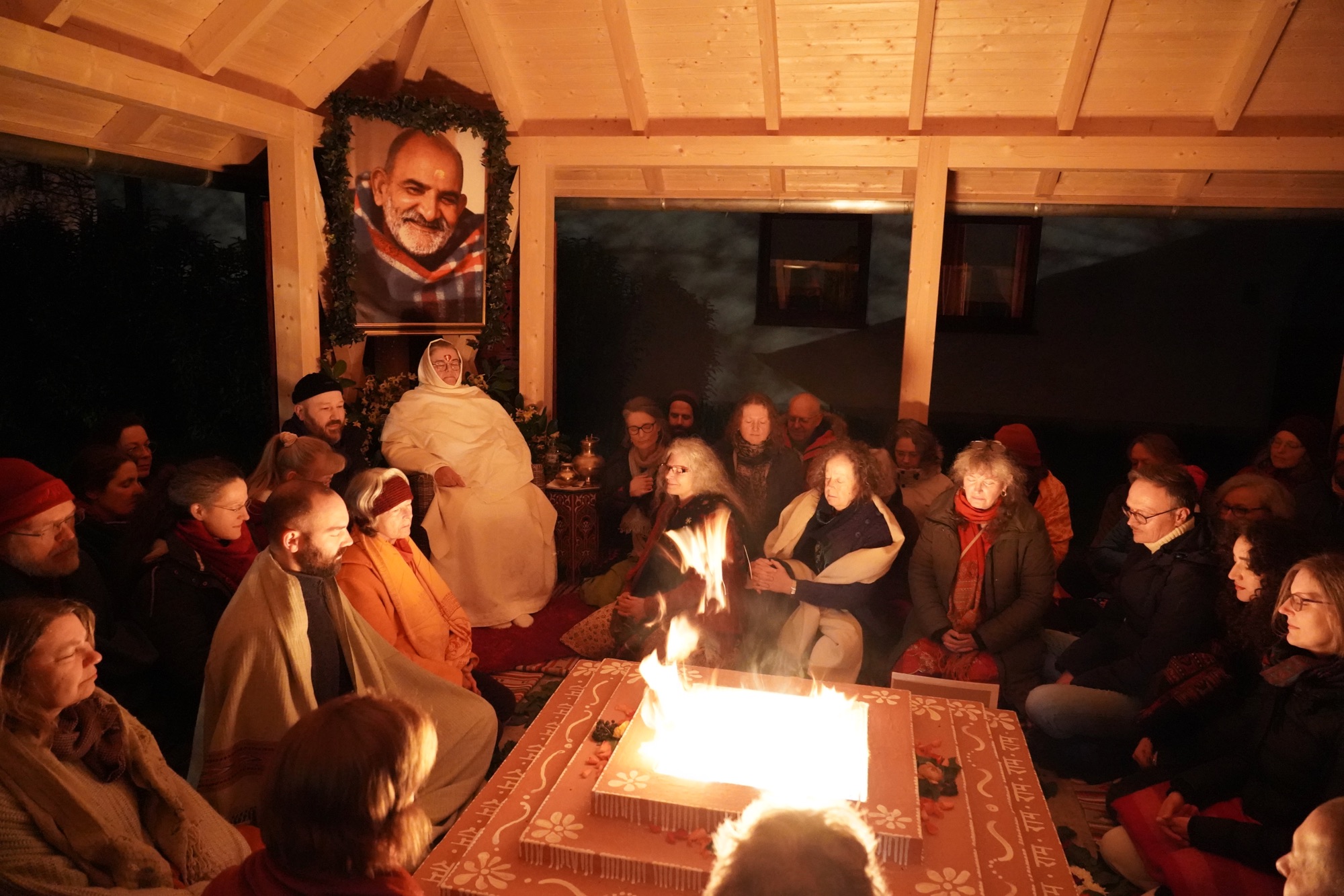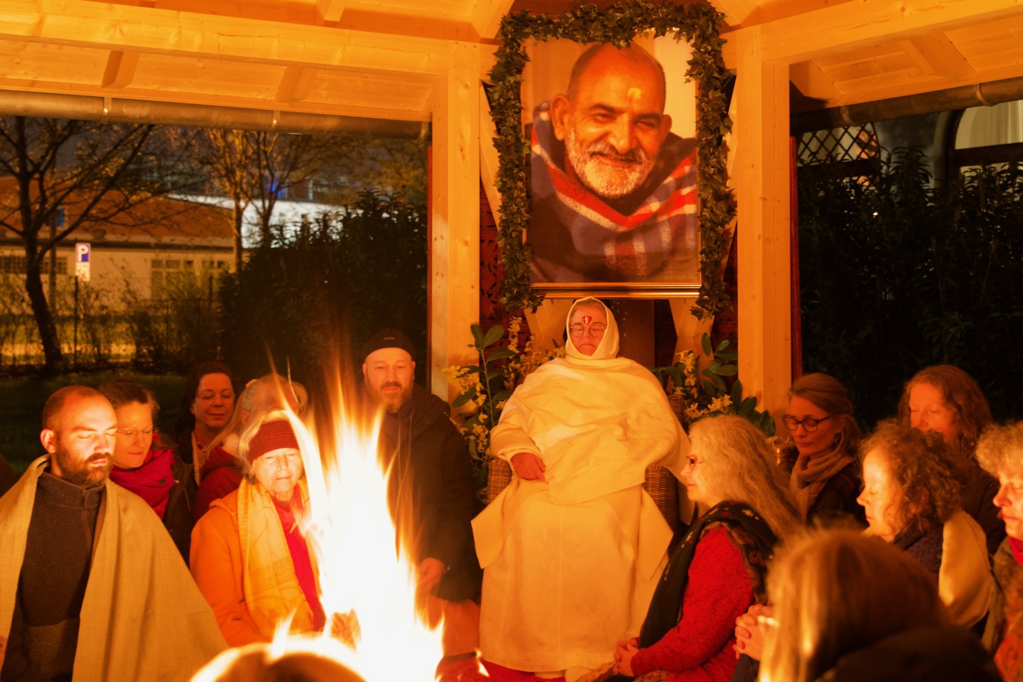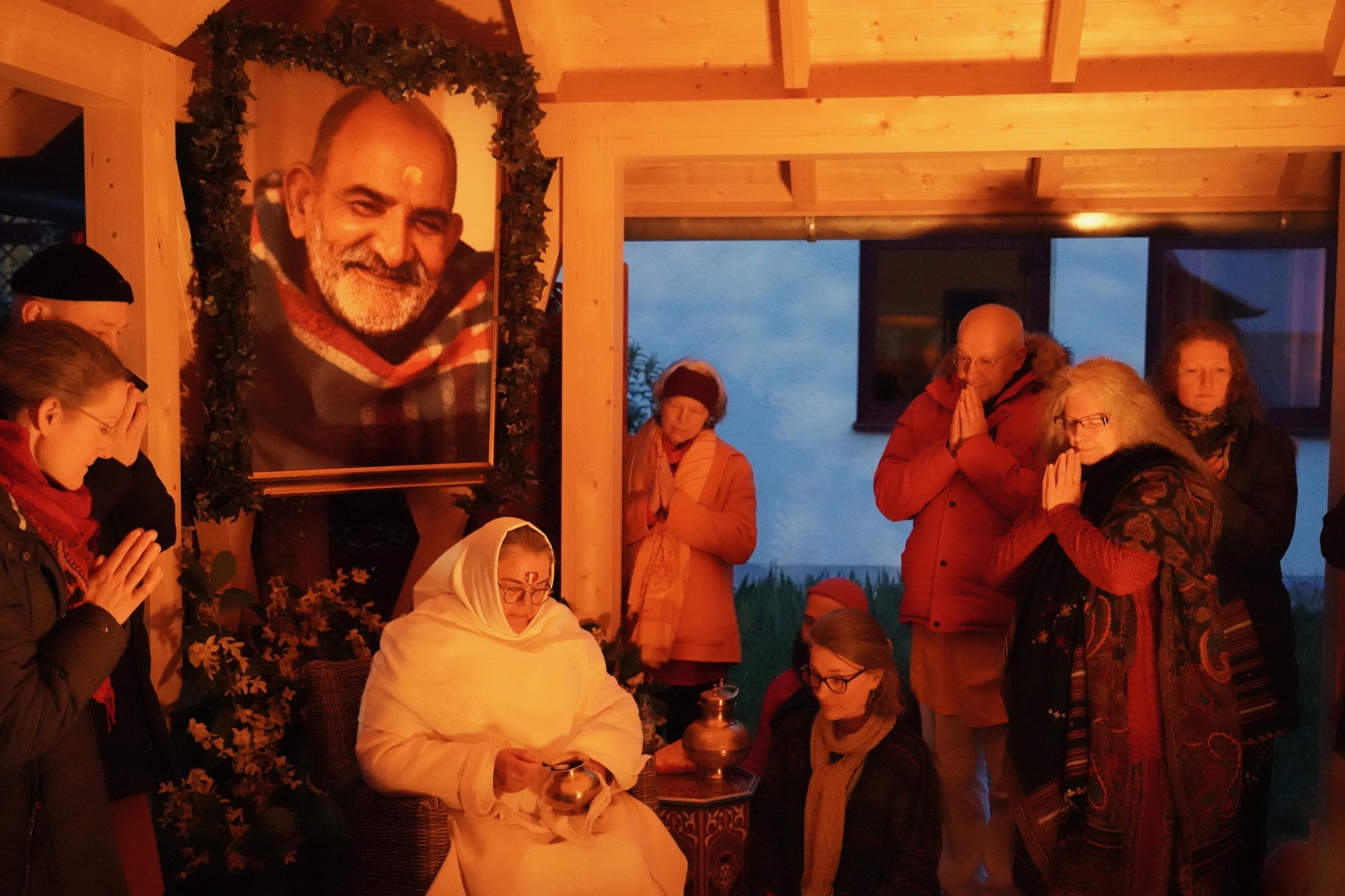 Am Ostersonntag waren wir früh morgens noch vor der Dämmerung mit Ma in Stille am Dhuni. Einzeln empfingen wir das Osterwasser aus Ma’s Hand, von dem Ma uns sagt:
