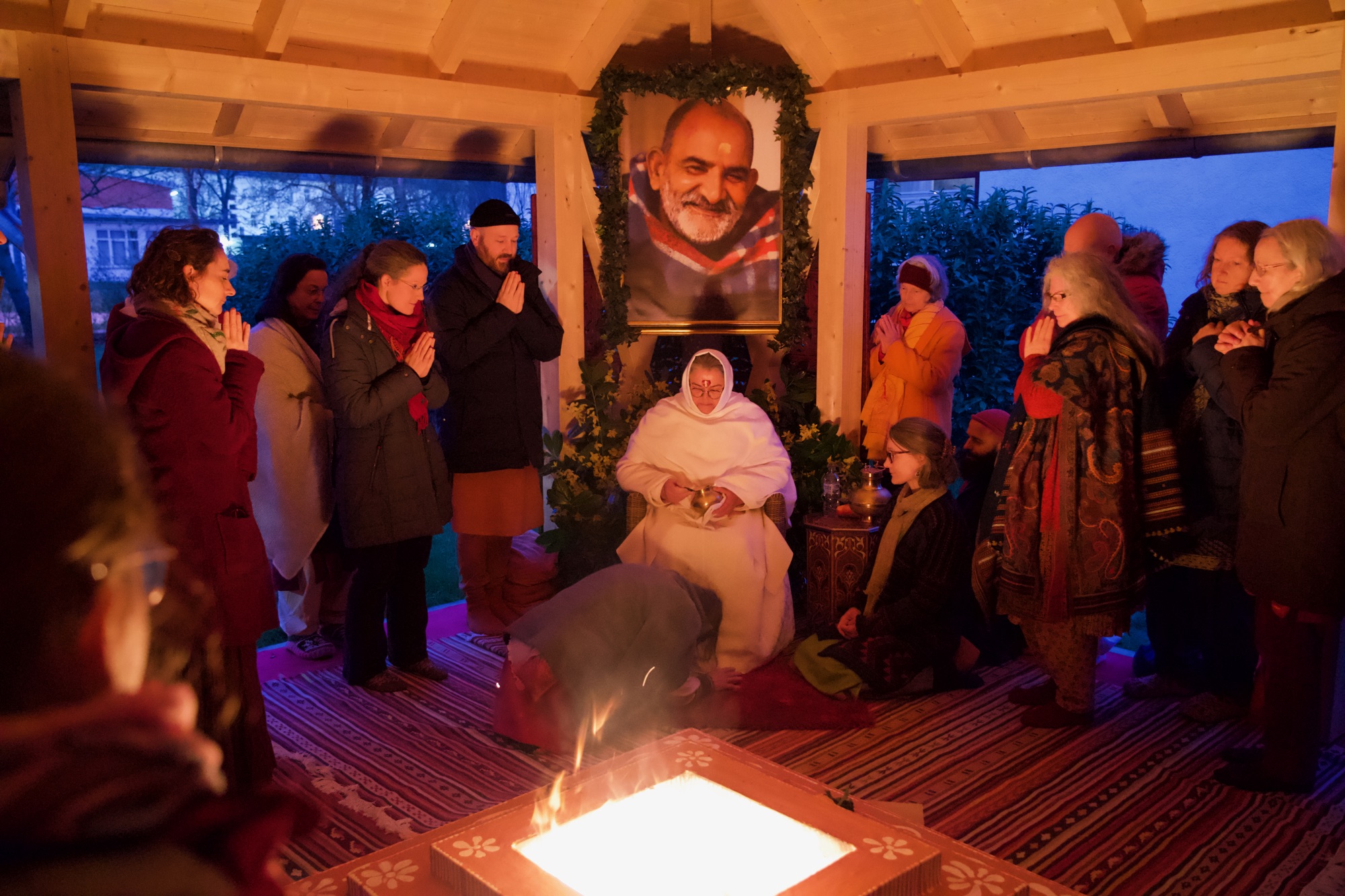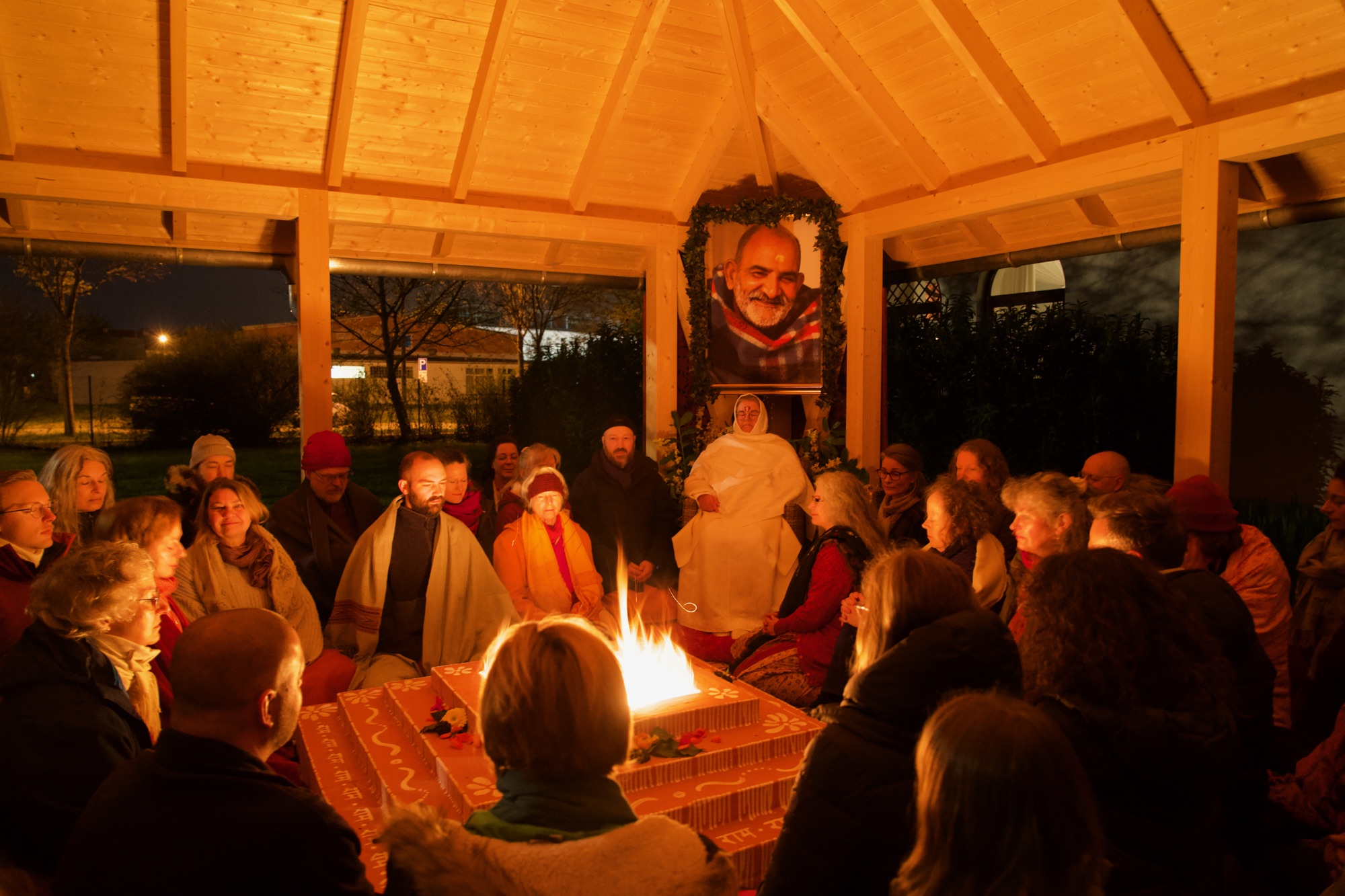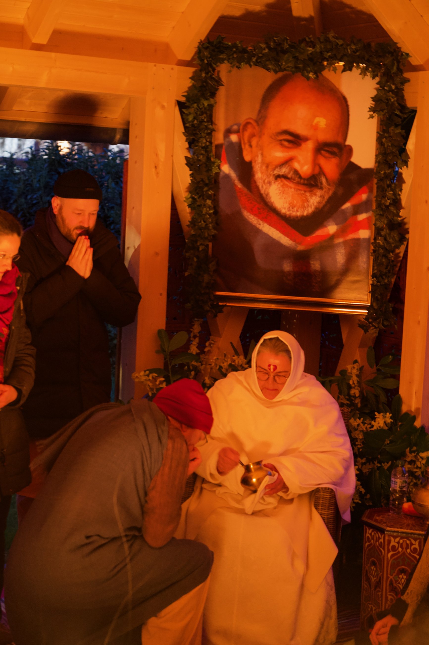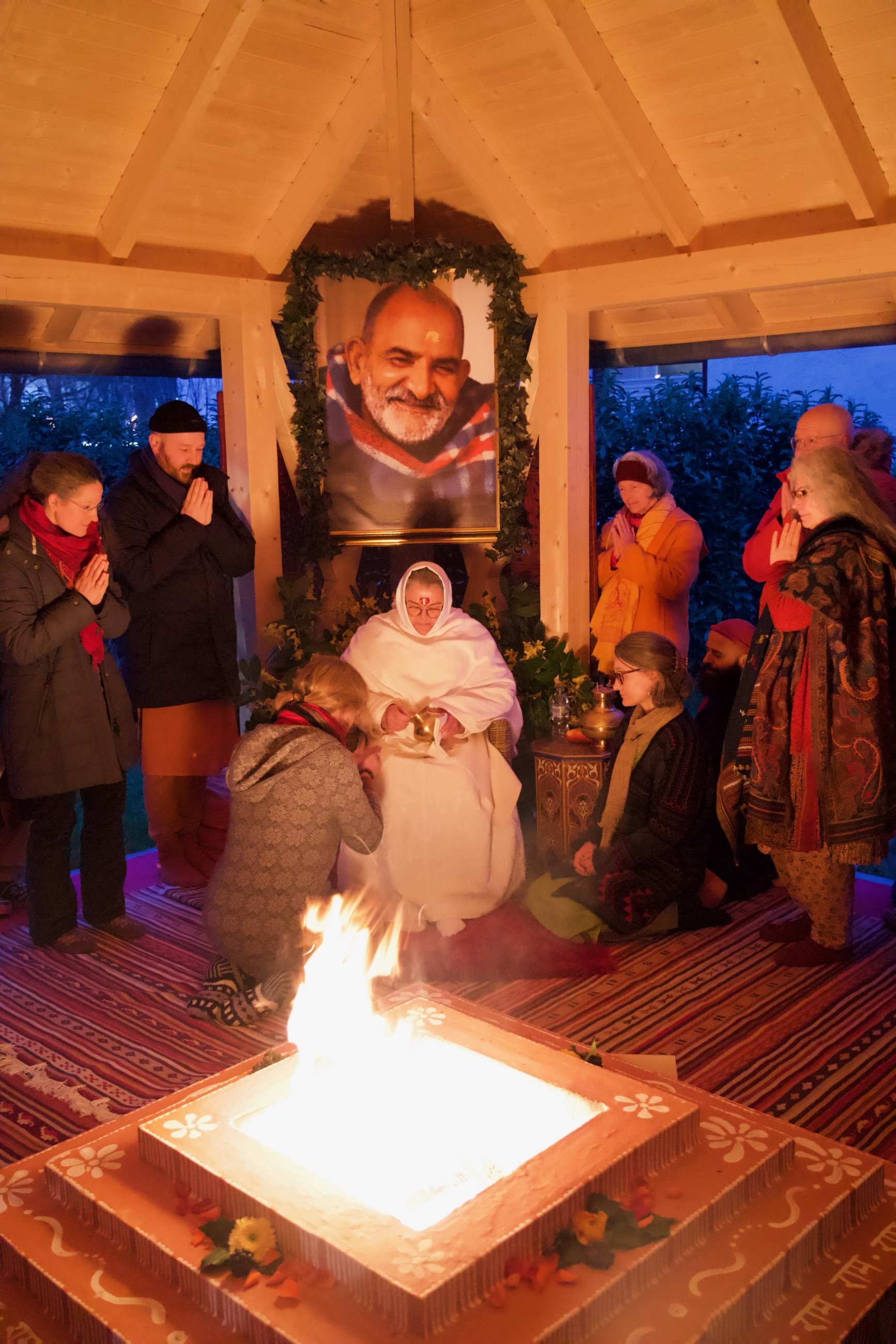 Am Ostersonntag waren wir früh morgens noch vor der Dämmerung mit Ma in Stille am Dhuni. Einzeln empfingen wir das Osterwasser aus Ma’s Hand, von dem Ma uns sagt: