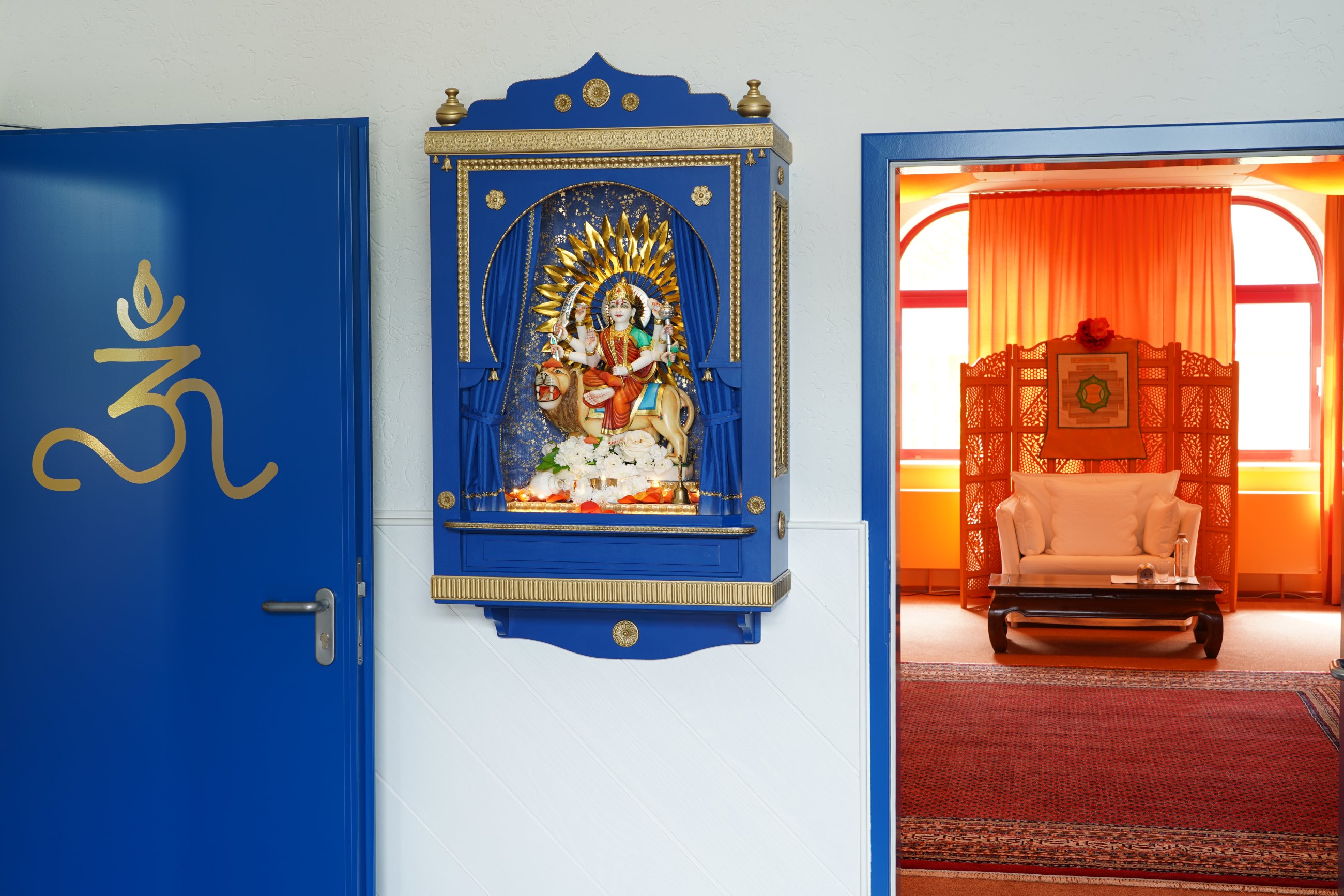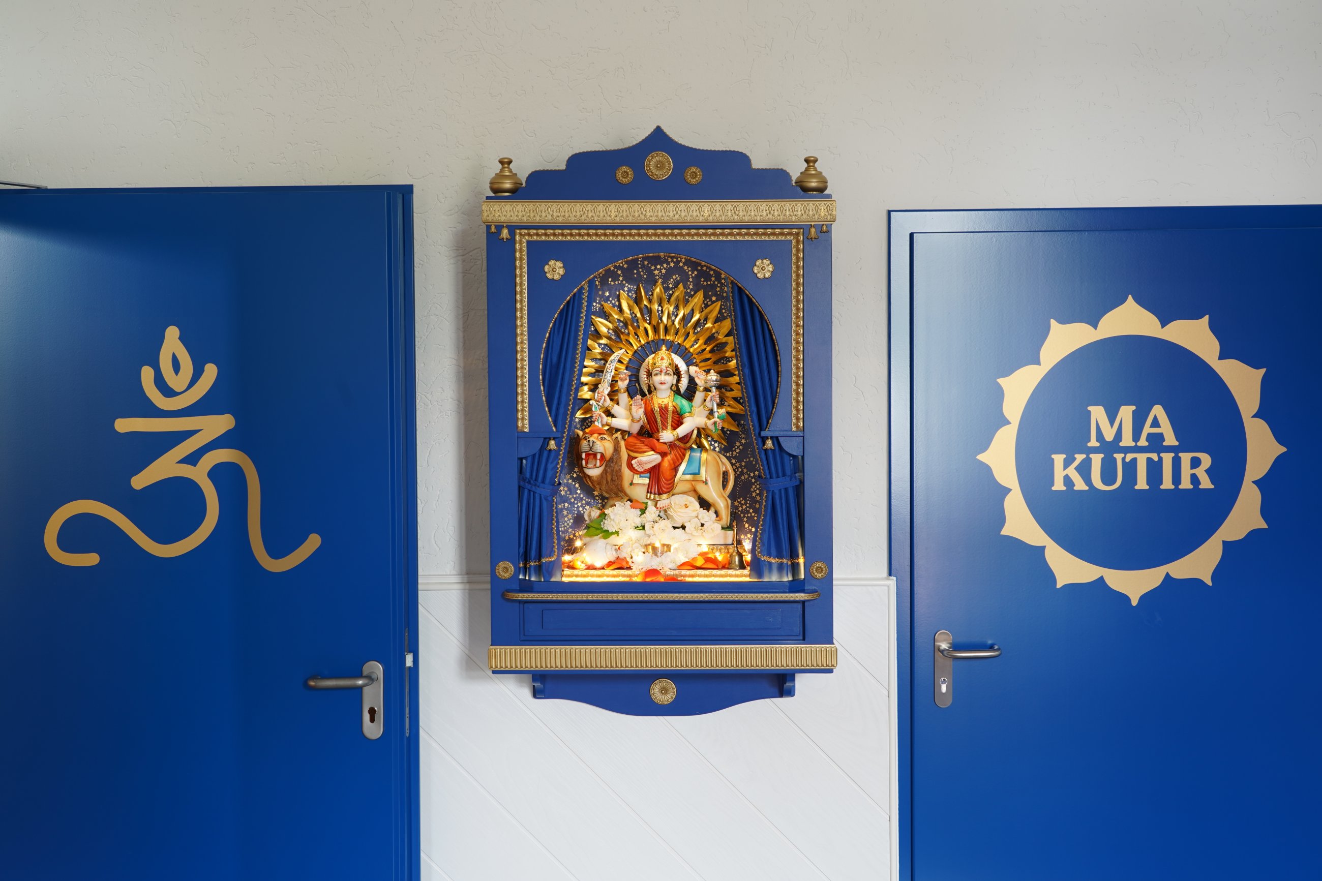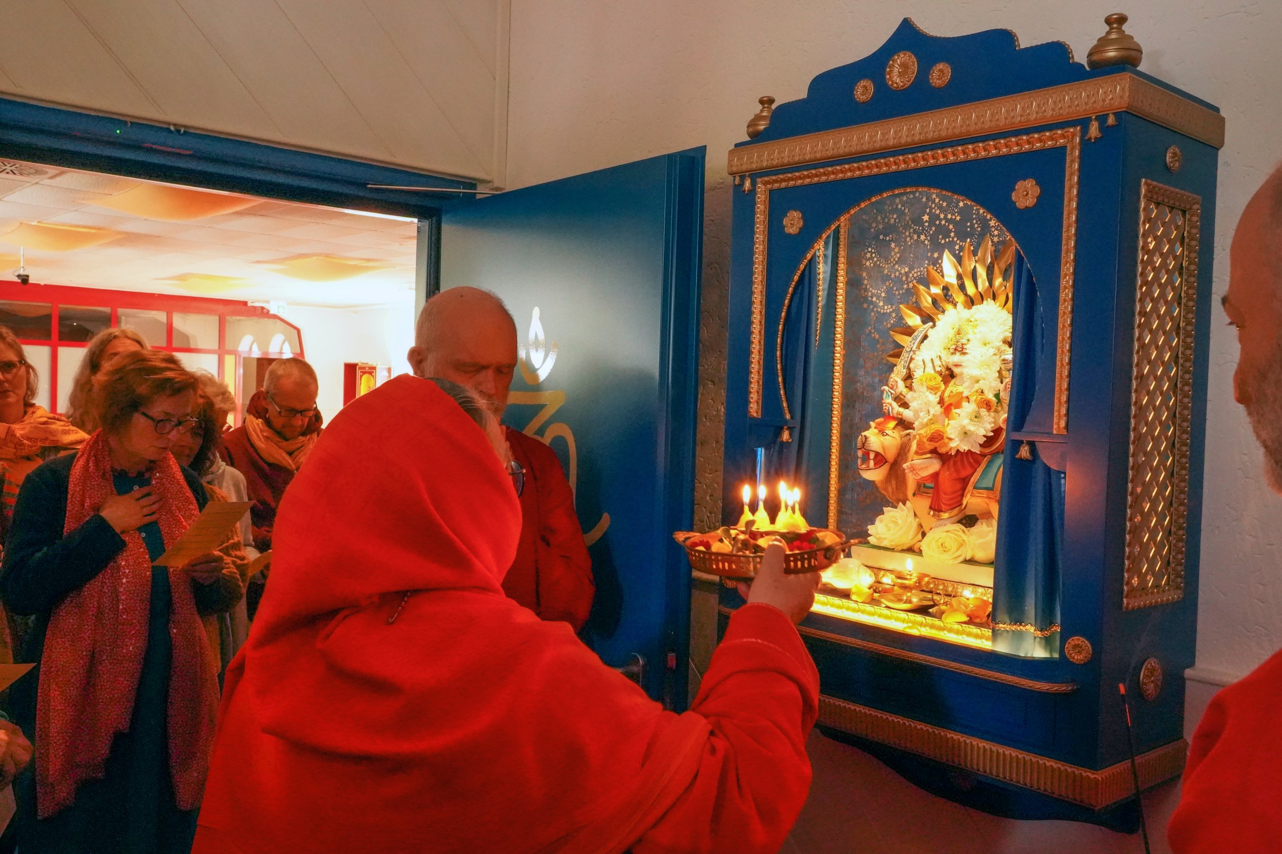 Staunend erlebten wir, wie Ma das Murti der Göttin Durga in ihrem Tempelschrein einweihte, sie schmückte und ihr mit ihrem Atem Leben einhauchte.