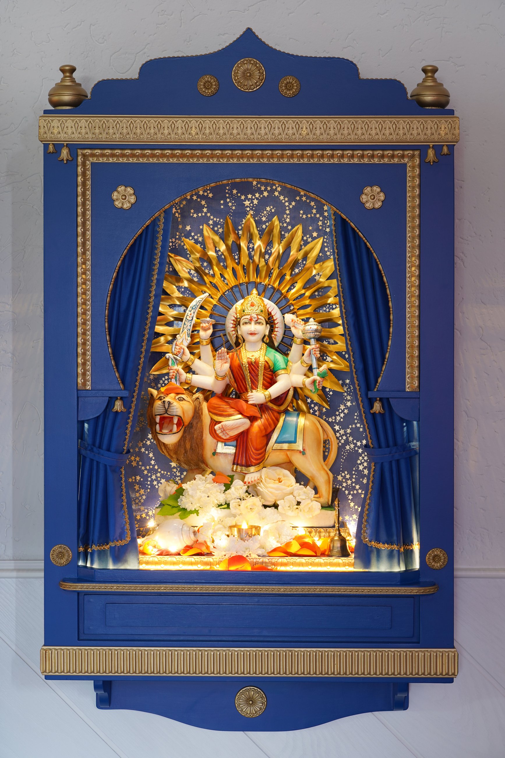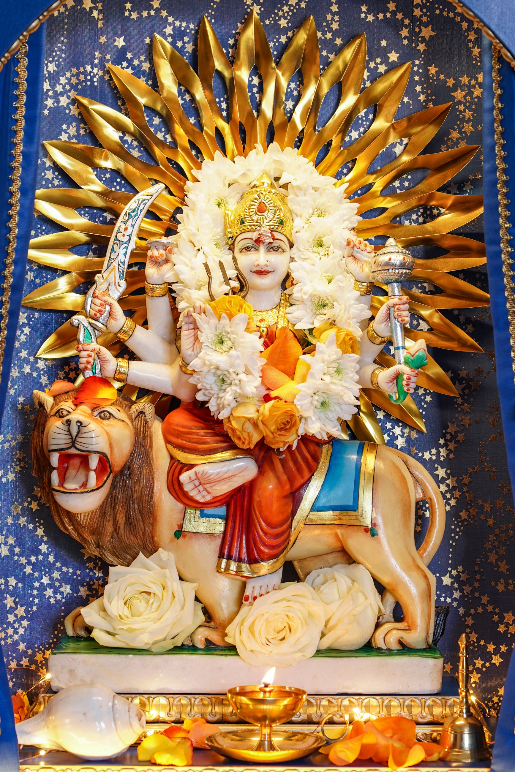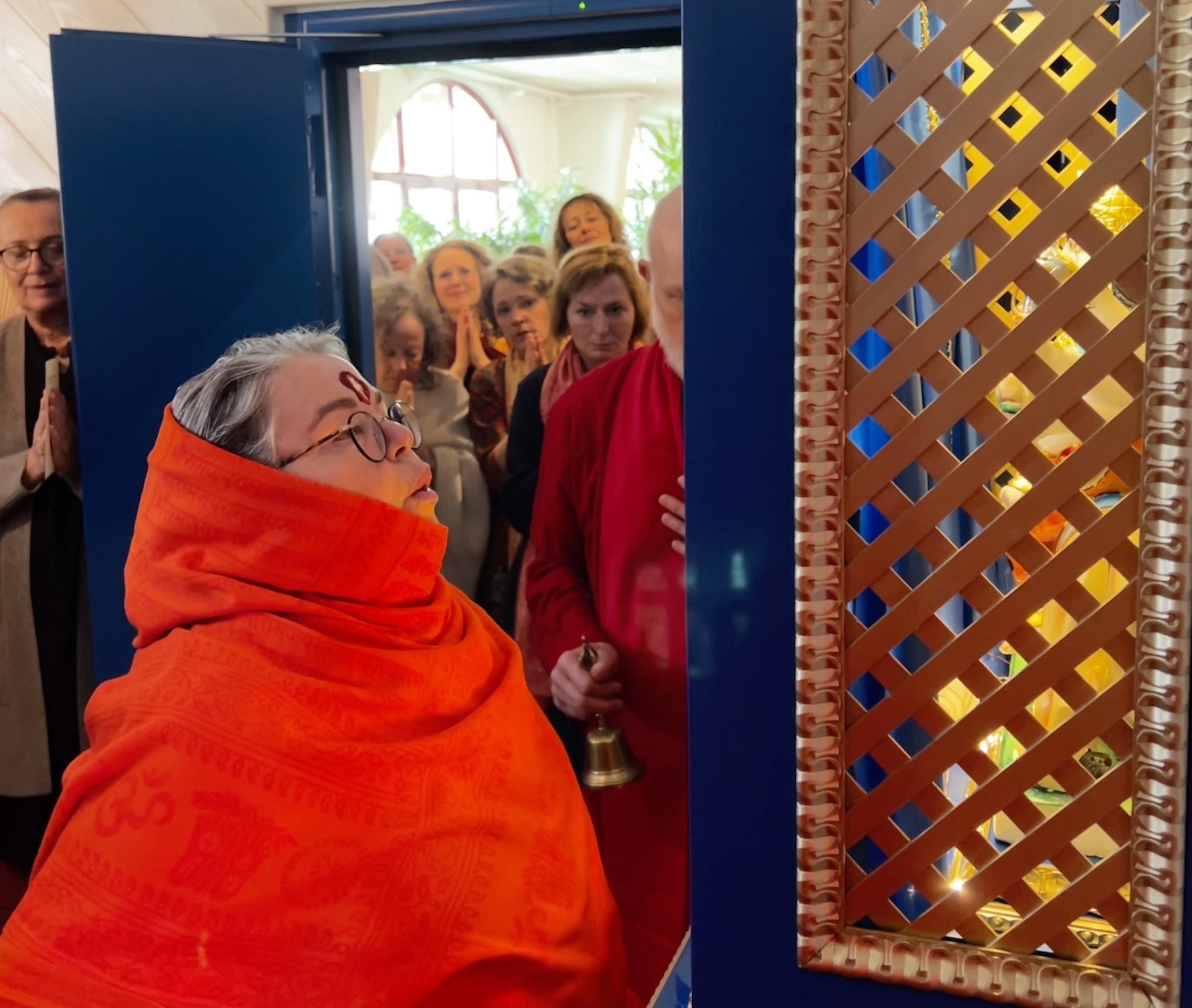 Staunend erlebten wir, wie Ma das Murti der Göttin Durga in ihrem Tempelschrein einweihte, sie schmückte und ihr mit ihrem Atem Leben einhauchte.