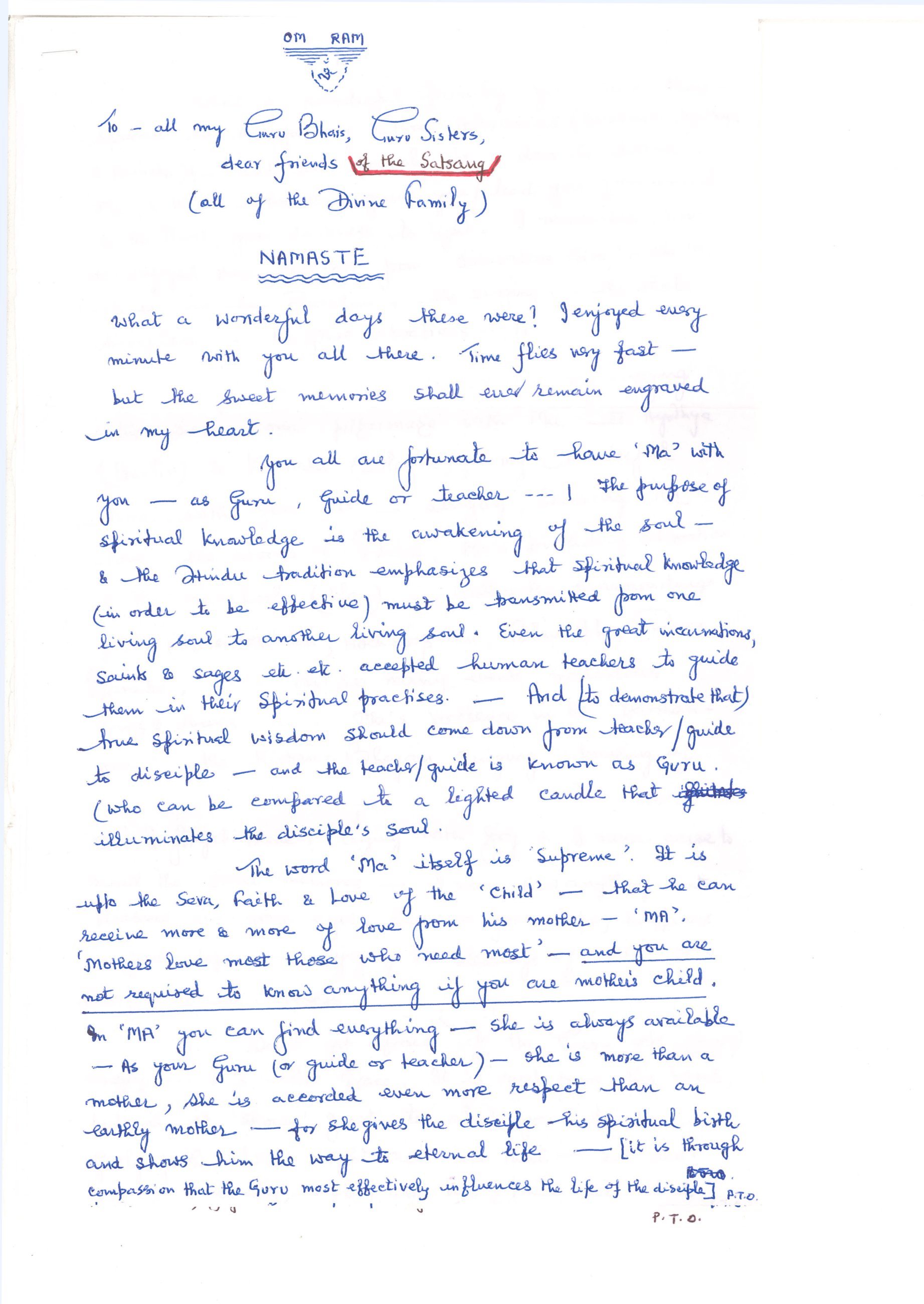 Nachdem KK im März 2006 von seinem Besuch im Ashram Brindavon wieder nach Indien zurückgekehrt war, schrieb er einen fünfseitigen Brief, in dem er sich voller Freude an seine Zeit im Ashram, seine Zeit mit Ma und ihren Chela erinnert - einen Teil davon möchten wir hier mit euch teilen: