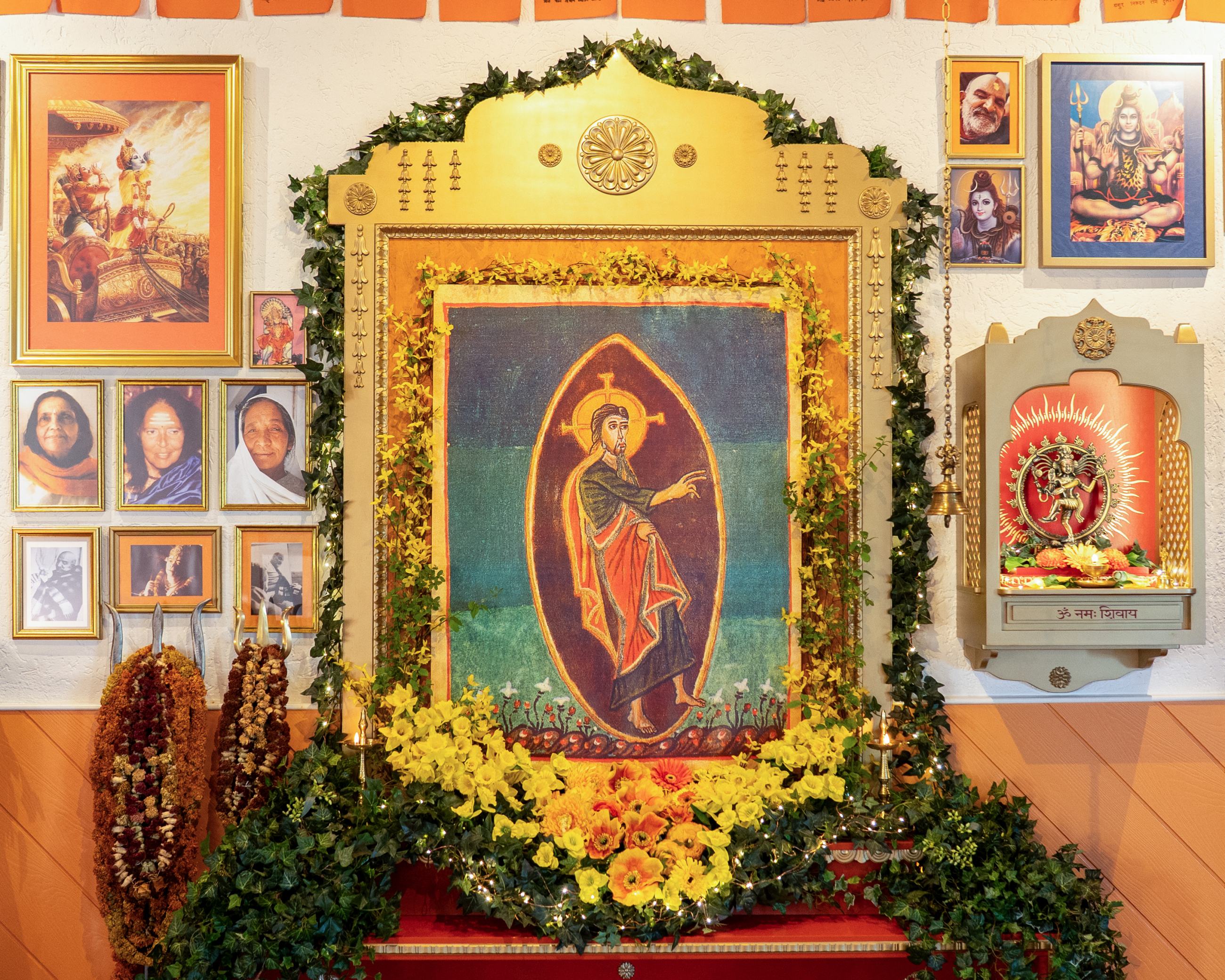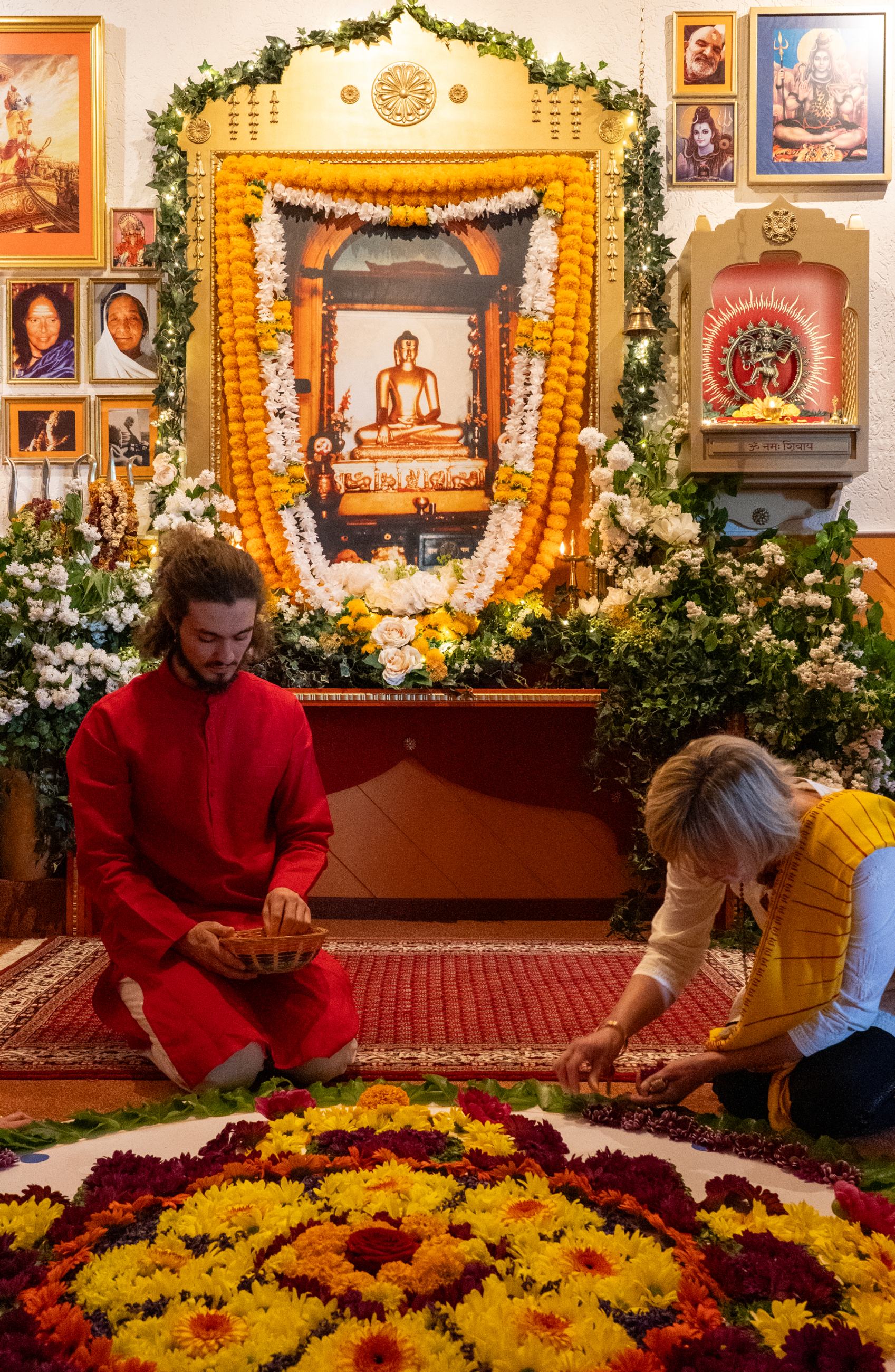 Auf ihrem eigenen Weg als spirituelle Schülerin begegnete Ma Sri Satya Narayan Goenka und erlernte von ihm die buddhistische Vipassana Meditation. So feiern wir im Ashram jedes Jahr Vesakh, das höchste Fest im Buddhismus – zu Ehren von Gautama Buddha, seiner Geburt und seiner Erleuchtung. In der Kirtanhalle, dem großen Raum in der Mitte des Baba Mandir, singen wir buddhistische Mantra und legen ein Blütenmandala.