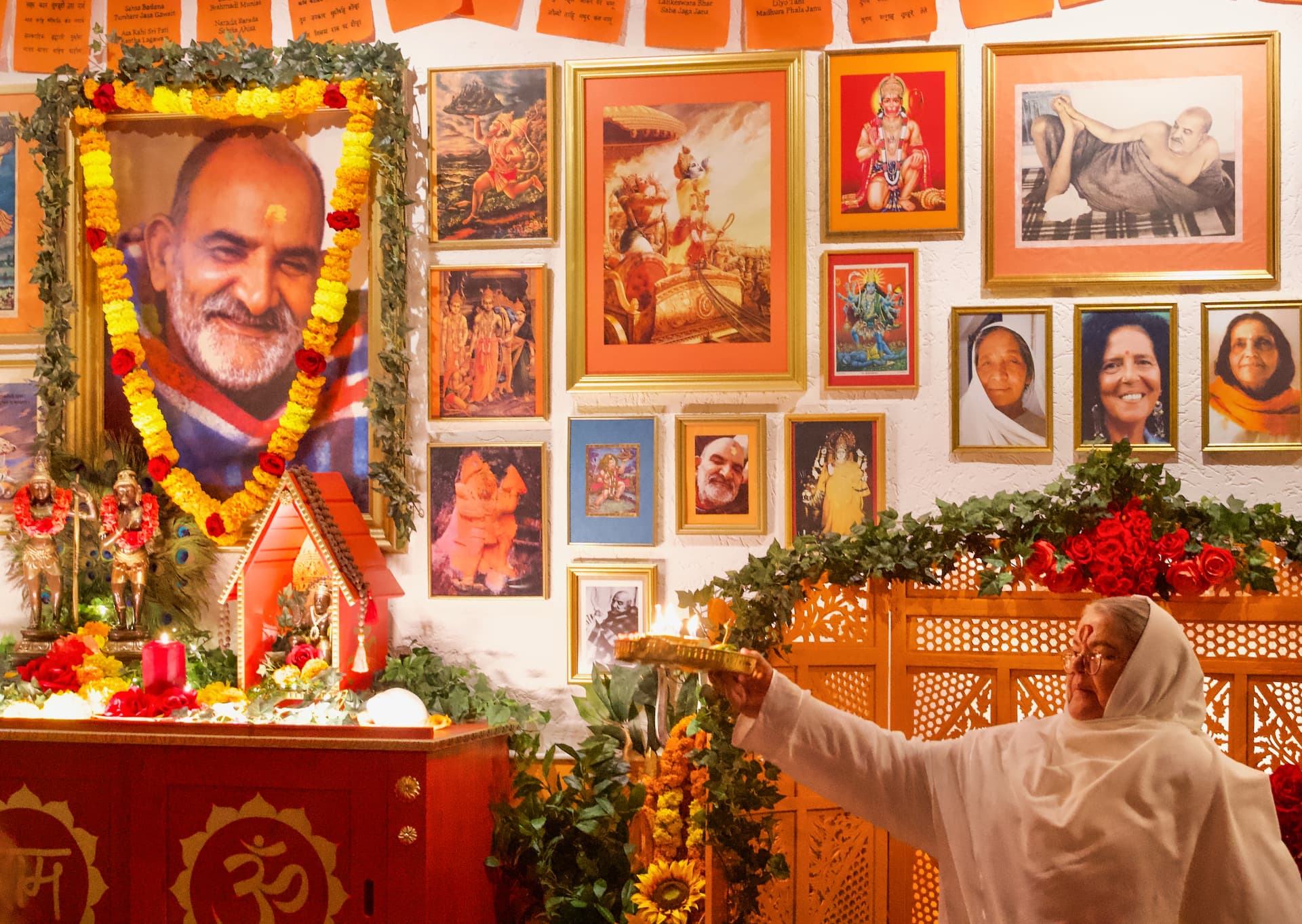 Das große, lang erwartete Ereignis des Jahres ist die Eröffnung des Baba Mandir zum Durga Puja Fest im Oktober 2021. Ma kommt am Freitagabend durch den Eingang zum Baba Kutir begleitet von vier Chela. In ihren Armen hält sie das Hanuman Murti, das Vishnu Digambar, Ma’s Ehemann und langjähriger Weggefährte, 1974 aus Indien mitbrachte. Ein Moment großer Freude erfüllte den Raum. Ma trägt Lord Hanuman zu seinem noch leeren Schrein, übergibt ihn einer Schülerin, die das Murti auf seinen Platz auf dem Altar stellt, derweil legt Ma ihre Hände auf die Schultern dieser Schülerin. Viele von uns können fühlen, wie Ma’s Liebe über die Schülerin in das Murti fließt. Wir feiern eine große leuchtende Aarti (Lichterzeremonie) zu Baba und Lord Hanuman, jeder Chela darf das Aarti-Licht vor unserer geliebten Meisterin schwenken und Ma segnet dann voller Freude alle mit diesem Licht.
