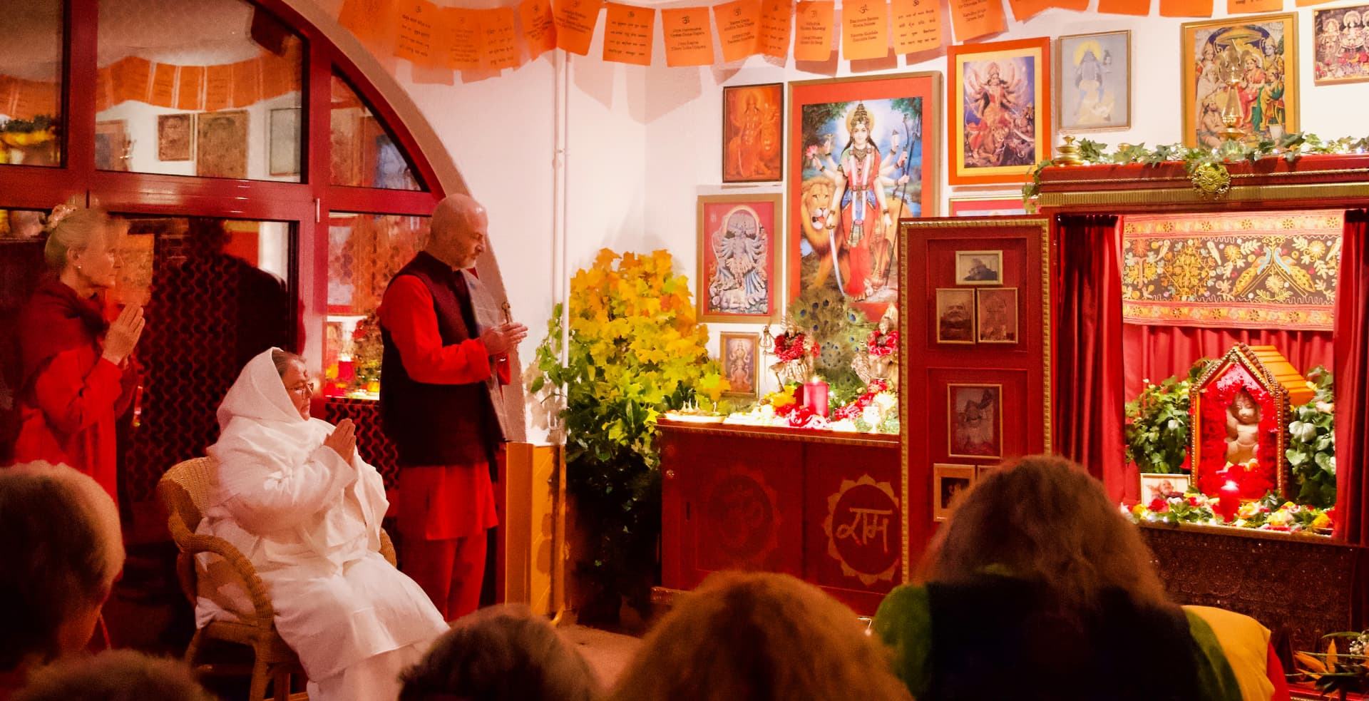 “Ao, Ao, Mere Angana, Durga Bhavani, Durga Bhavani, Ma Ambe Bhavani” – Komm, göttliche Mutter Durga Bhavani, komm zu mir in meinen Hof, in mein Haus … zart mischten sich andere Stimmen darunter – “Ao, Ao, Mere Angana, Durga Bhavani …” eine solche Süße. Einer von Ma’s jungen indischen Schülern bat, etwas auf Hindi zu Ma zu sagen. Laut und voller Liebe sagte er: “Ma, aap mere angana agaye!” Und übersetzte für uns alle: Ma, Du bist zu mir in mein Haus gekommen! Ein Augenblick der Stille – und Ma antwortet: