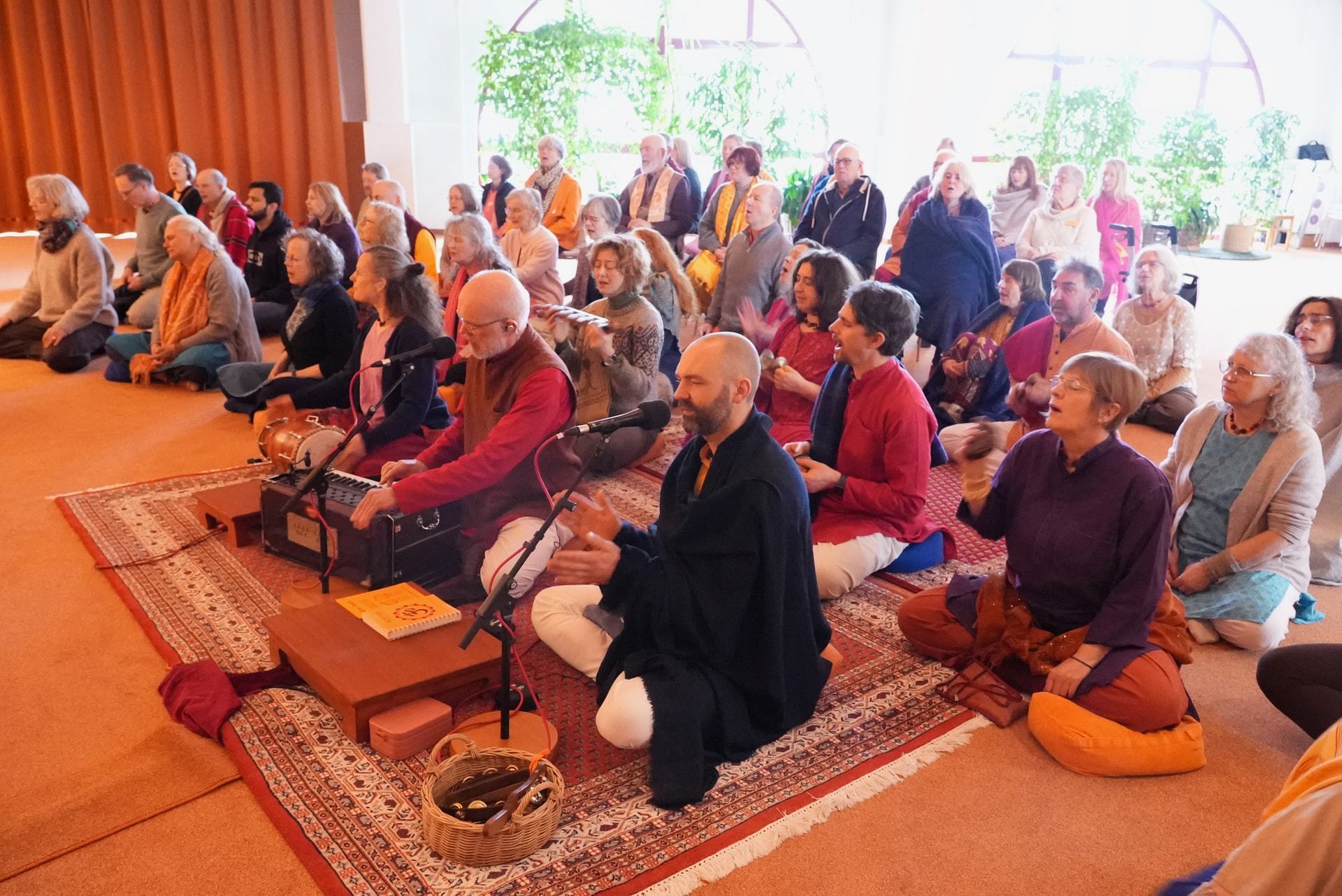 Nachdem Ma uns am Samstagvormittag zu unserer großen Freude eine Jahreslosung für 2026 gegeben hatte, gab sie am Abend einen sehr intensiven Darshan für alle, in der Kirtanhalle. Zunächst ging es um die Jahreslosung, darum alles, was war, zurückzulassen, das Gute und auch das weniger Gute gleichermaßen. Ma sagte, für sie existiere das Jahr 2025 bereits wie nicht mehr, und sprach auch von dem Buch „Die Vermessung der Welt“ über den großen Entdecker Alexander von Humboldt, von dem es heißt, er habe etwas, das ihm nicht gelungen ist, in der gleichen Minute noch vergessen und einfach weitergemacht – und ist so in die entlegensten Gegenden vorgedrungen. Unsere Meisterin nannte das „bewusstes Verdrängen“ und forderte dazu auf, uns darin zu üben, in der Begegnung mit ihr. Wenn eine Begegnung in meinen Augen nicht so zufriedenstellend verlaufen ist, nicht daran festzuhalten und damit die nächste zu überschatten, so dass die Vergangenheit immer die Zukunft bestimmt, sondern uns im „bewussten Verdrängen“ zu üben, jeden Moment neu anfangen zu können.