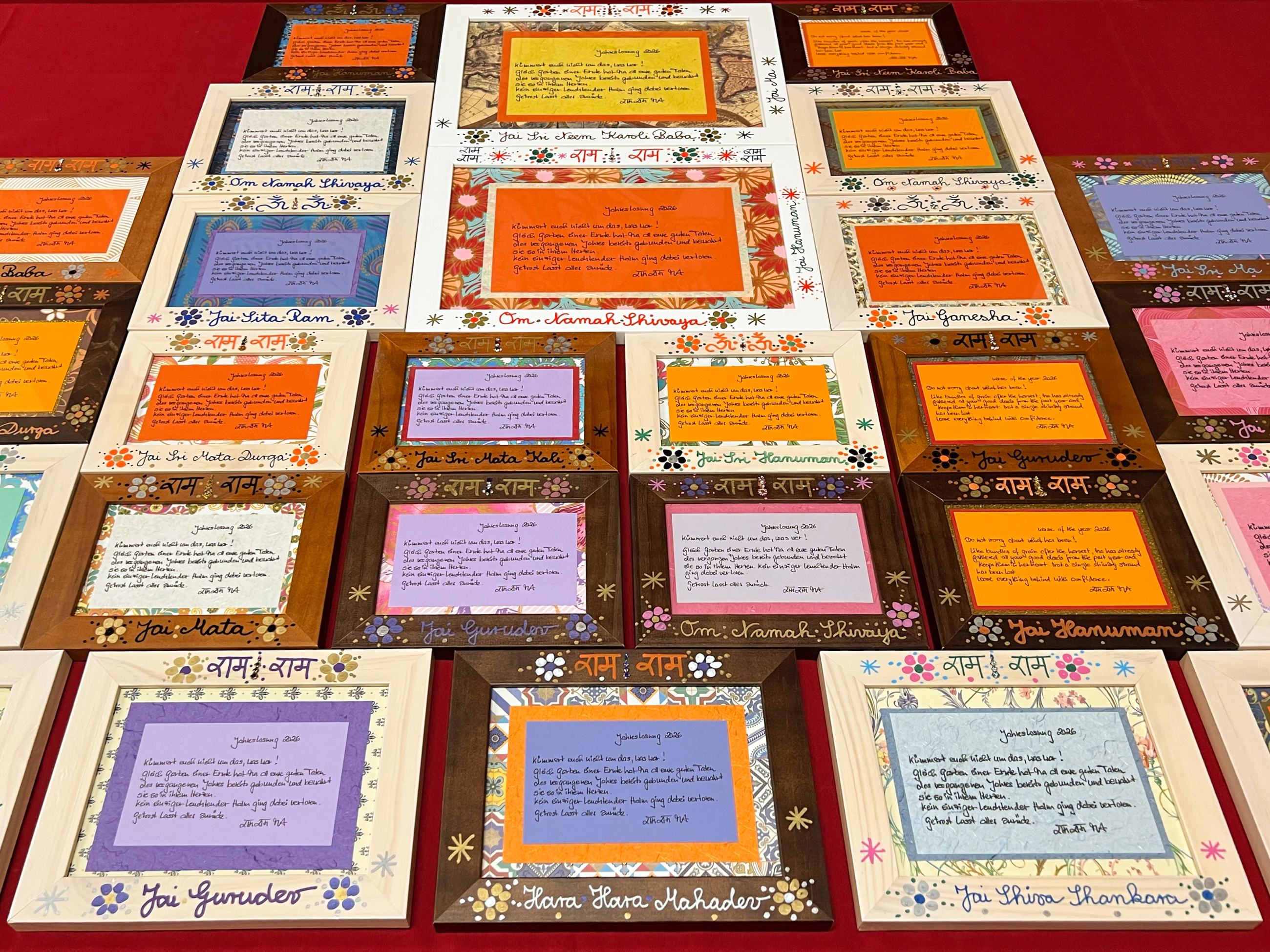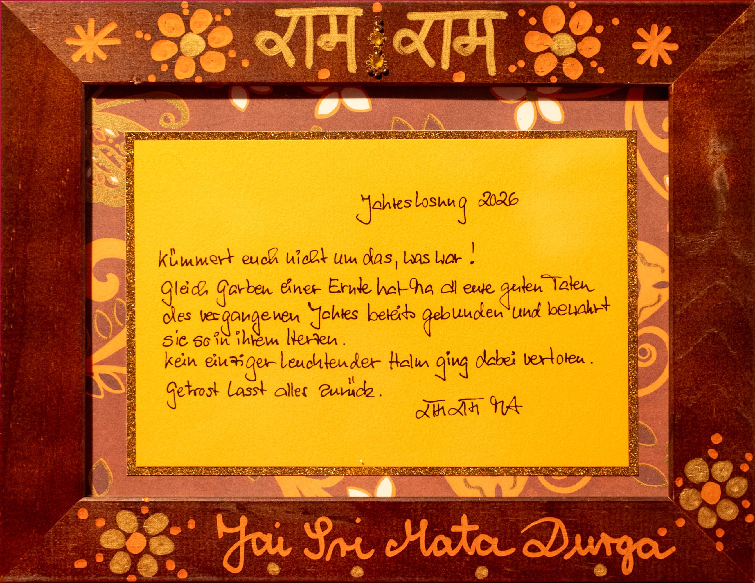 Lange habe ich die von meiner Meisterin geschmückte und gesegnete Jahreslosung heute in den Händen gehalten und betrachtet. Aus jeder Farbwahl, jedem Strich, jedem Muster, dem RAM und dem Jai Ma auf dem Rahmen der Jahreslosung spricht zu mir Ma’s vollkommene Hingabe an den Moment. So erreichen mich Ma’s Worte direkt im Herzen, die mit dem Satz schließen:
