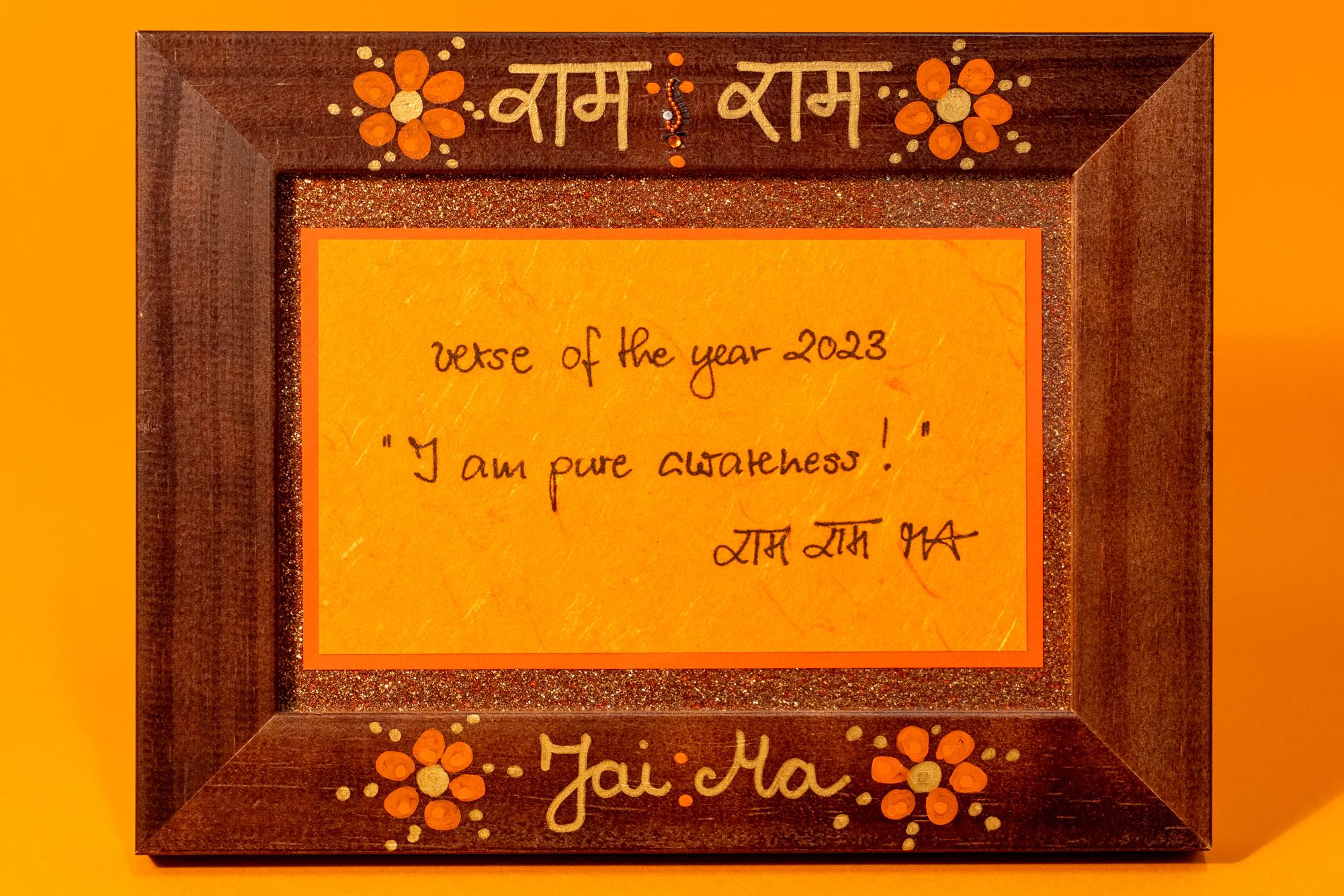 It inspires our daily practice and highlights the inner power and perspective we aim to embody in the current year. The verse is printed on beautiful colored paper and framed. Every frame is blessed by Ma’s own handwriting.