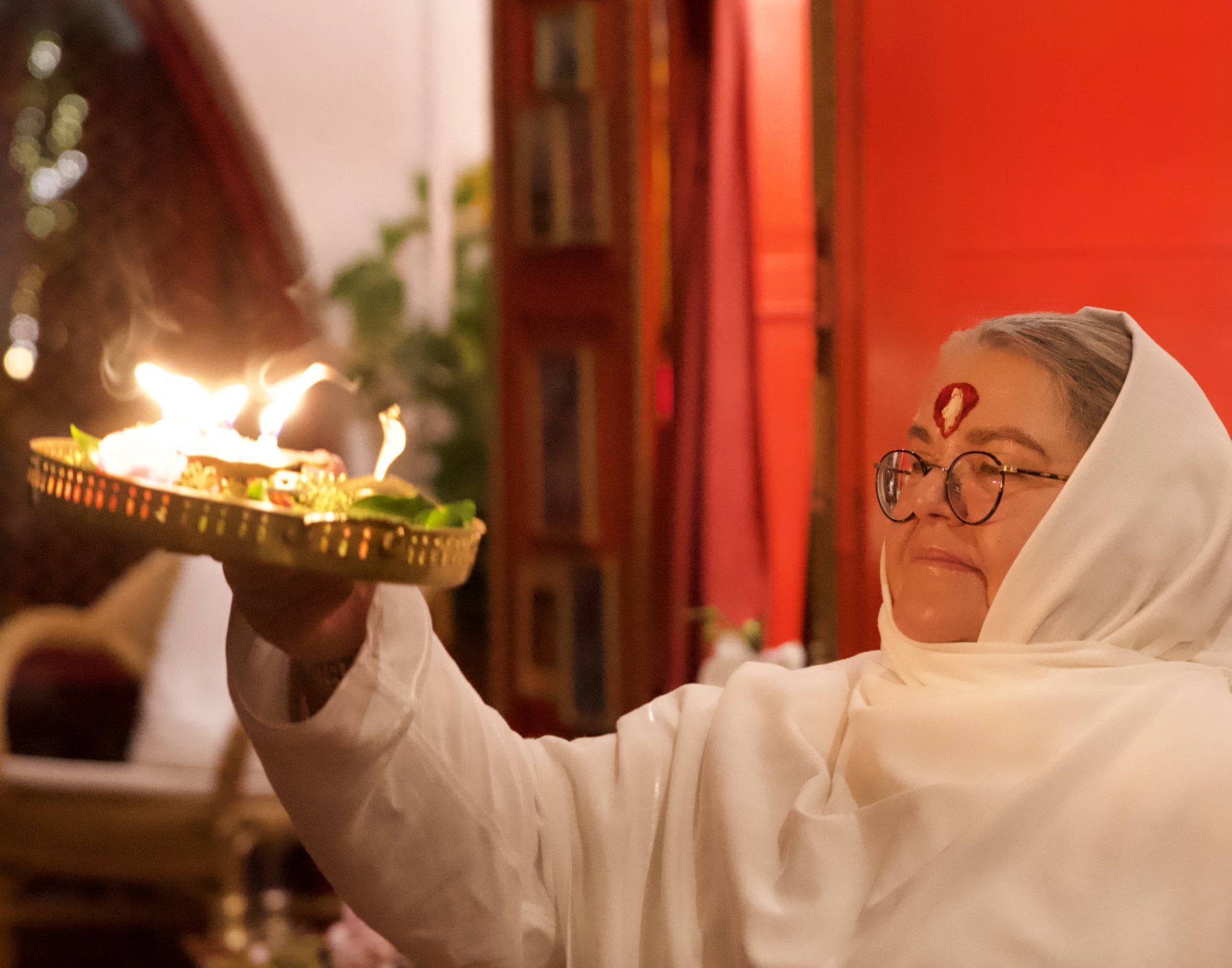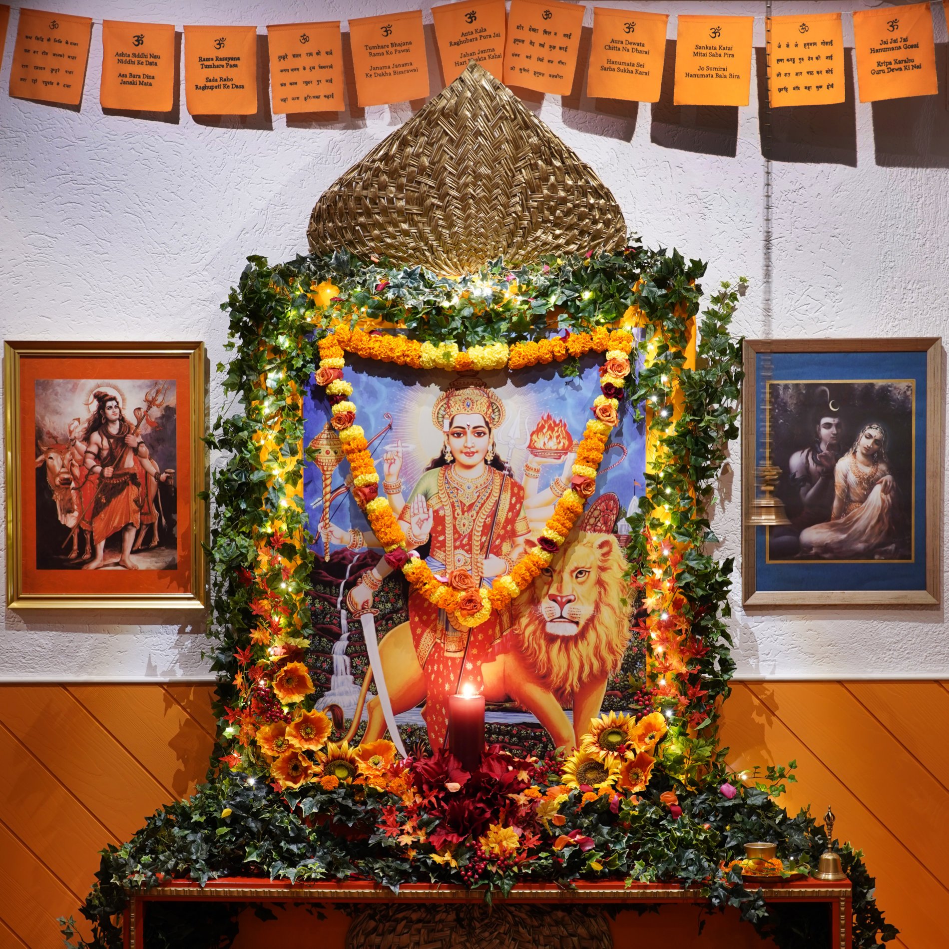 As dusk was falling, the second part of the festival began and we were several more in numbers. We gathered around the large altar to Devi Durga and after the pujari had presented the aarti light to Ma, Ma opened the festive aarti celebration.